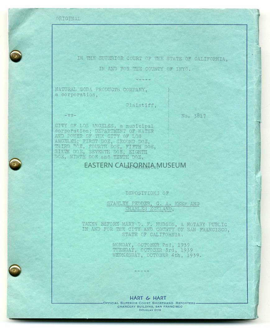 Original copy of a court document. Cover reads: In the Superior Court of the State of California, in and for the County of Inyo, Natural Soda Products Company, a corporation, Plaintiff, vs. City of Los Angeles, a municipal corporation; Department of Water and Power of the City of Los Angeles; First Doe, Second Doe, Third Doe, Fourth Doe, Fifth Doe, Sixth Doe, Seventh Doe, Eighth Doe, Ninth Doe, and Tenth Doe, Defendants. No. 3817. Depositions of Stanley Pedder, G. A. Keep, and Charles Eckland taken before Mary D. F. Hudson, a Notary Public in and for the City and County of San Francisco, State of California. Monday, October 2nd, 1939, Tuesday, October 3rd, 1939, Wednesday, October 4th, 1939.