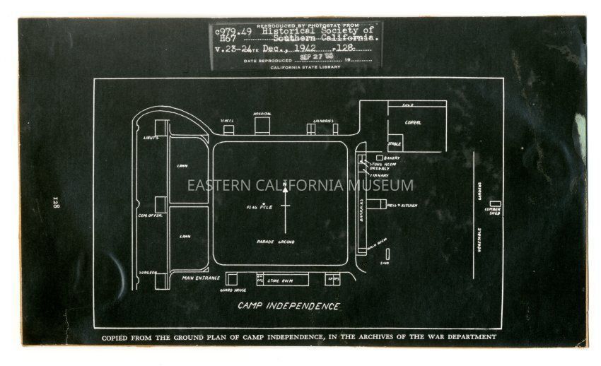 Copied from the Ground Plan of Camp Independence, in the archives of the War Department. Reproduced by photostat from the Historical Society of Southern California on September 24, 1955. Call number c979.49 H67, v. 23-24.