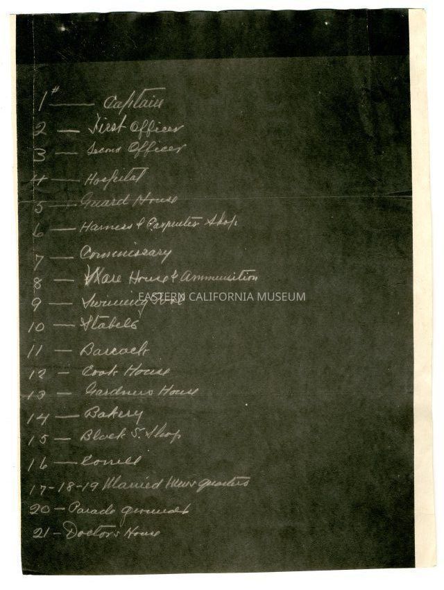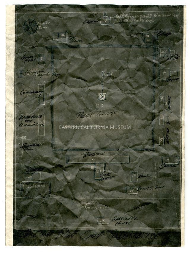Copy of a diagram of Camp Independence with an accompanying sheet listing and identifying the buildings. Drawing by Judge William D. Dehy. The original belongs to Dorothy C. Cragen. Photostats were made in the Recorder's office. 2 pages.Made/Created