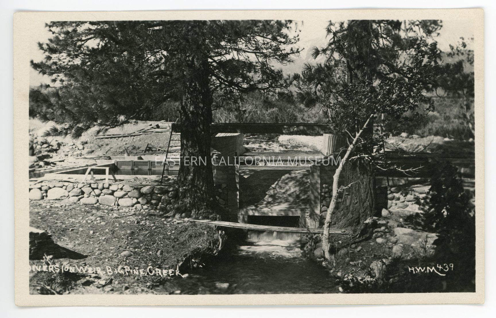 Photo postcard titled, "Division Weir, Big Pine Creek" taken by photographer H. W. Mendenhall and given his ID #439.Collection