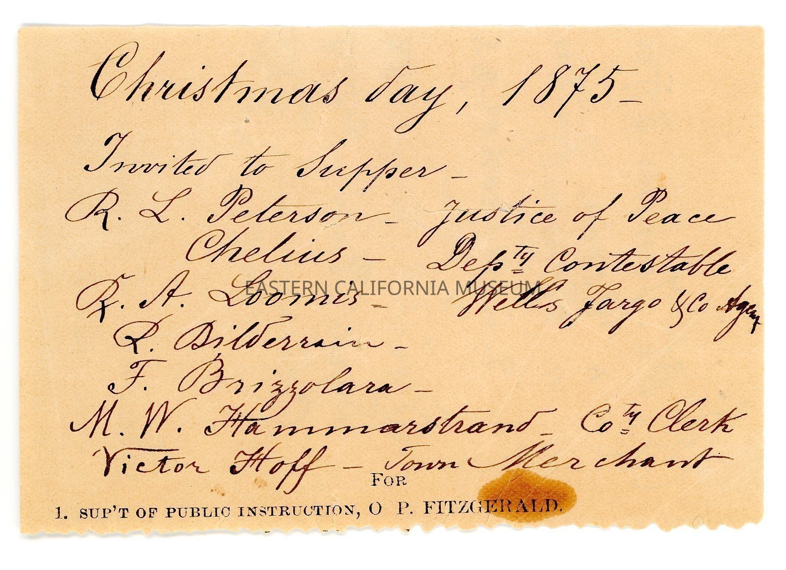Handwritten in ink: Christmas day, 1875 / Invited to Supper / R. L. Peterson (Justice of Peace), Chelius (Deputy Constable), R. A. Loomis (Wells Fargo & Co. Agent), R. Dilderrain, F. Brizzolara, M. W. Hammerstrand (County Clerk), Victor Hoff (Town Merchant).