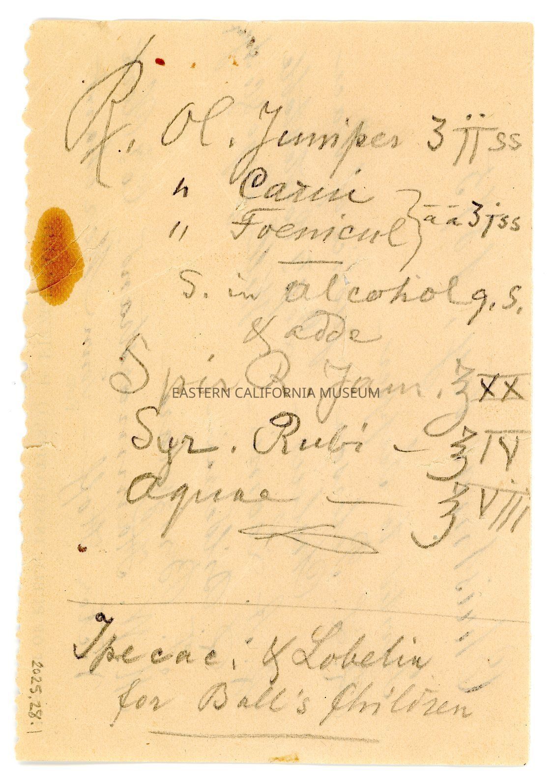 Handwritten in pencil on reverse appears to be the recipe for a prescription. "For Ball's children" is written at the bottom.Collection
