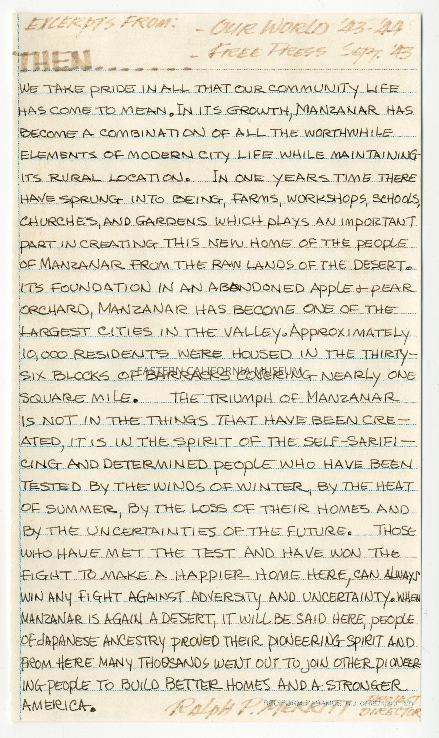 Handwritten document containing excerpts from Our World 1943-1944 (the Manzanar High School yearbook) and the Manzanar Free Press, September 1943.