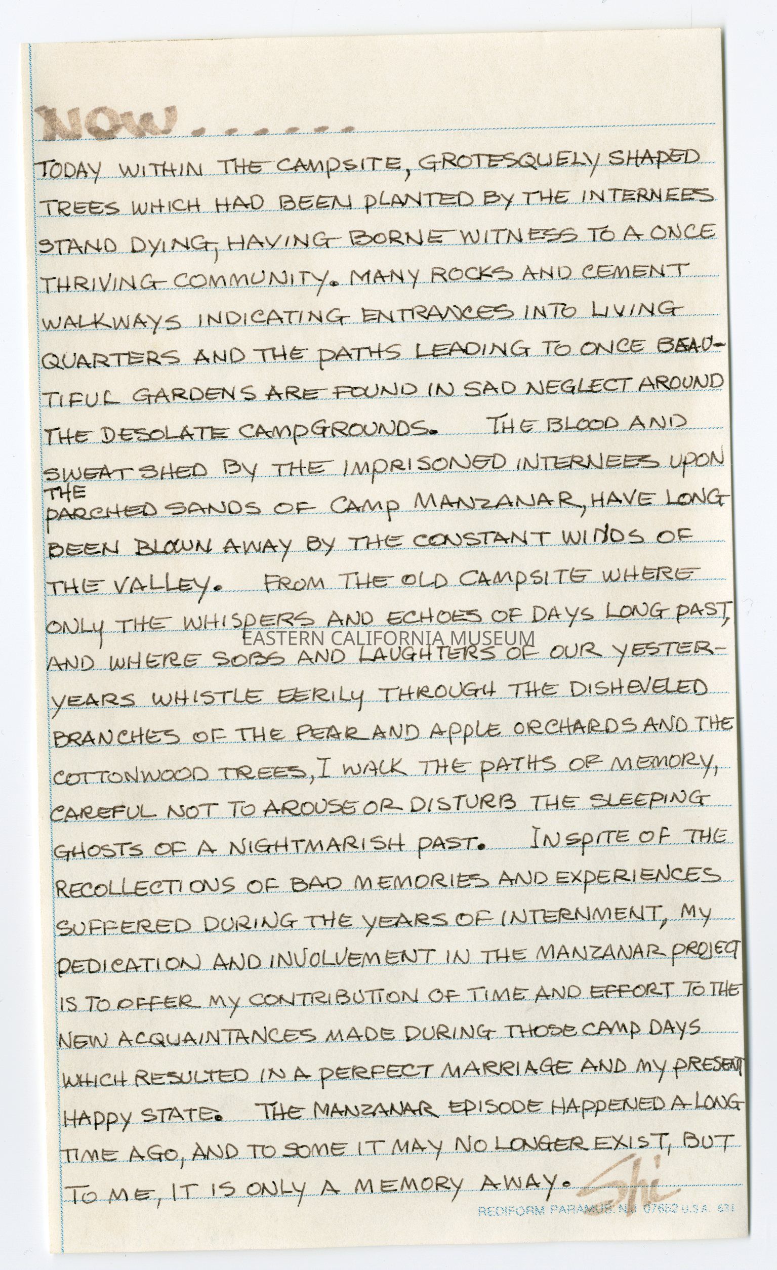 Today within the campsite, grotesquely shaped trees which had been planted by the internees stand dying, having borne witness to a once thriving community. Many rocks and cement walkways indicating entrances into living quarters and the paths leading to once beautiful gardens are found in sad neglect around the desolate campgrounds. The blood and sweat shed by the imprisoned internees upon the parched sands of Camp Manzanar have long been blown away by the constant winds of the valley. From the old campsite where only the whispers and echoes of days long past, and where sobs and laughters of our yesteryears whistle eerily through the disheveled branches of the pear and apple orchards and the cottonwood trees, I walk the paths of memory, careful not to arouse or disturb the sleeping ghosts of a nightmarish past. In spite of the recollections of bad memories and experiences suffered during the years of internment, my dedication and involvement in the Manzanar Project is to offer my contribution of time and effort to the new acquaintances made during those camp days which resulted in a perfect marriage and my present happy state. The Manzanar episode happened a long time ago, and to some it may no longer exist, but to me, it is only a memory away. --ShiCollection