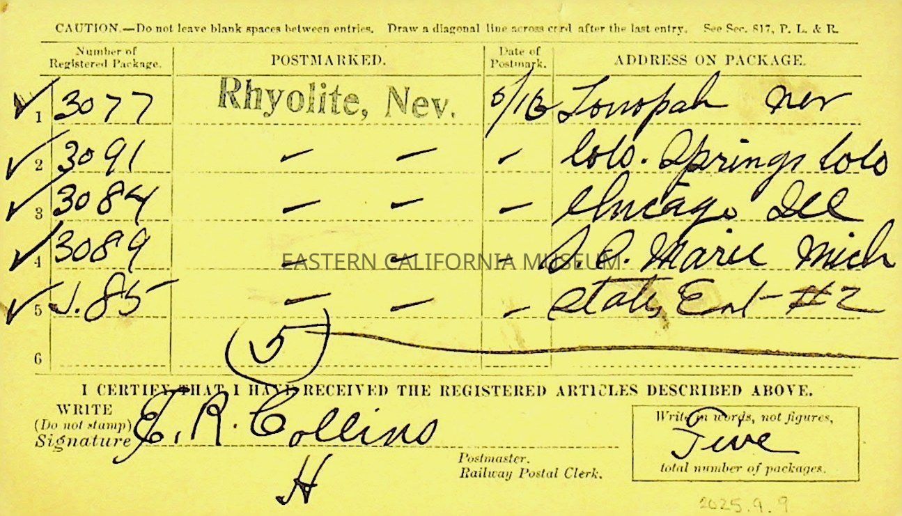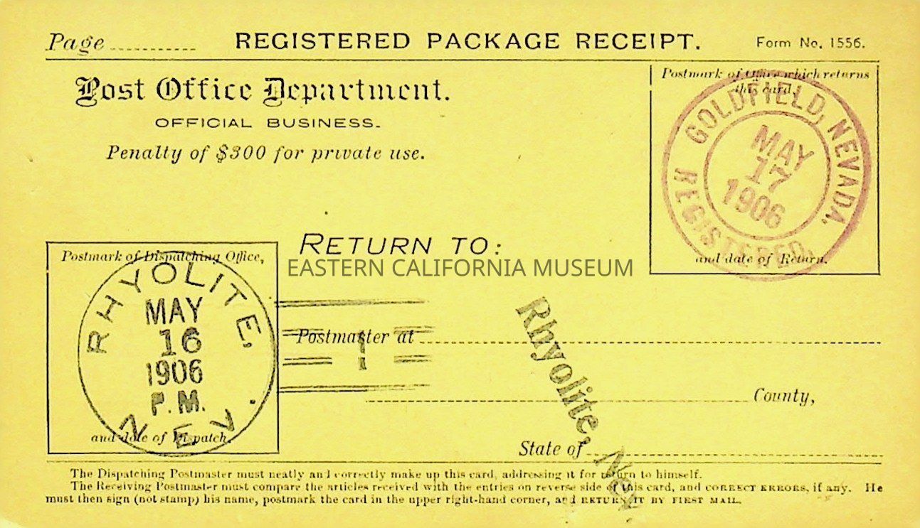 9. Registered Package Receipt postcard with stamps from Rhyolite (05/16/1906) and Goldfield (05/17/1906). Signed by Collins.