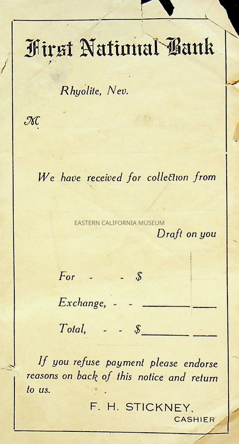 10. Blank receipt, First National Bank, Rhyolite, "We have received for collection from...F. H. Stickney, Cashier."