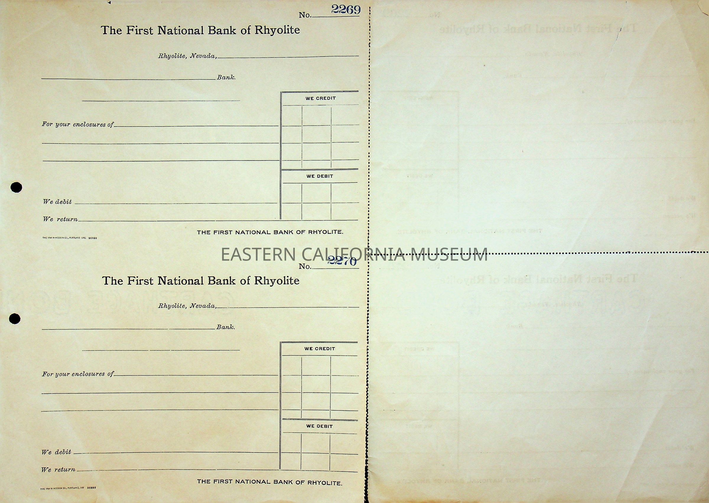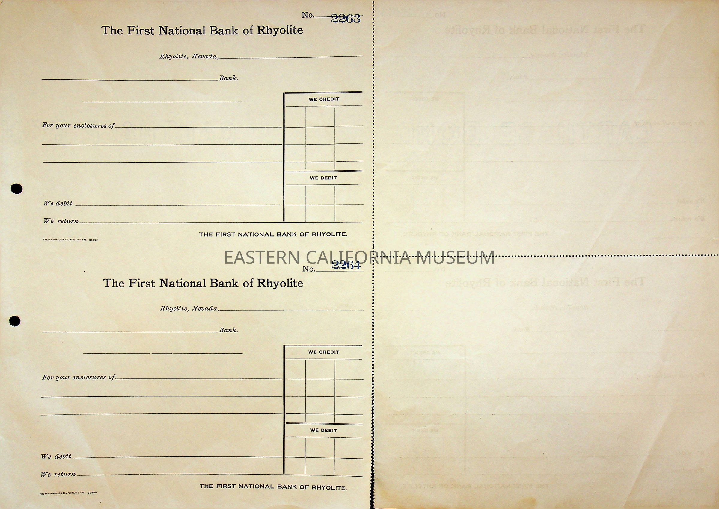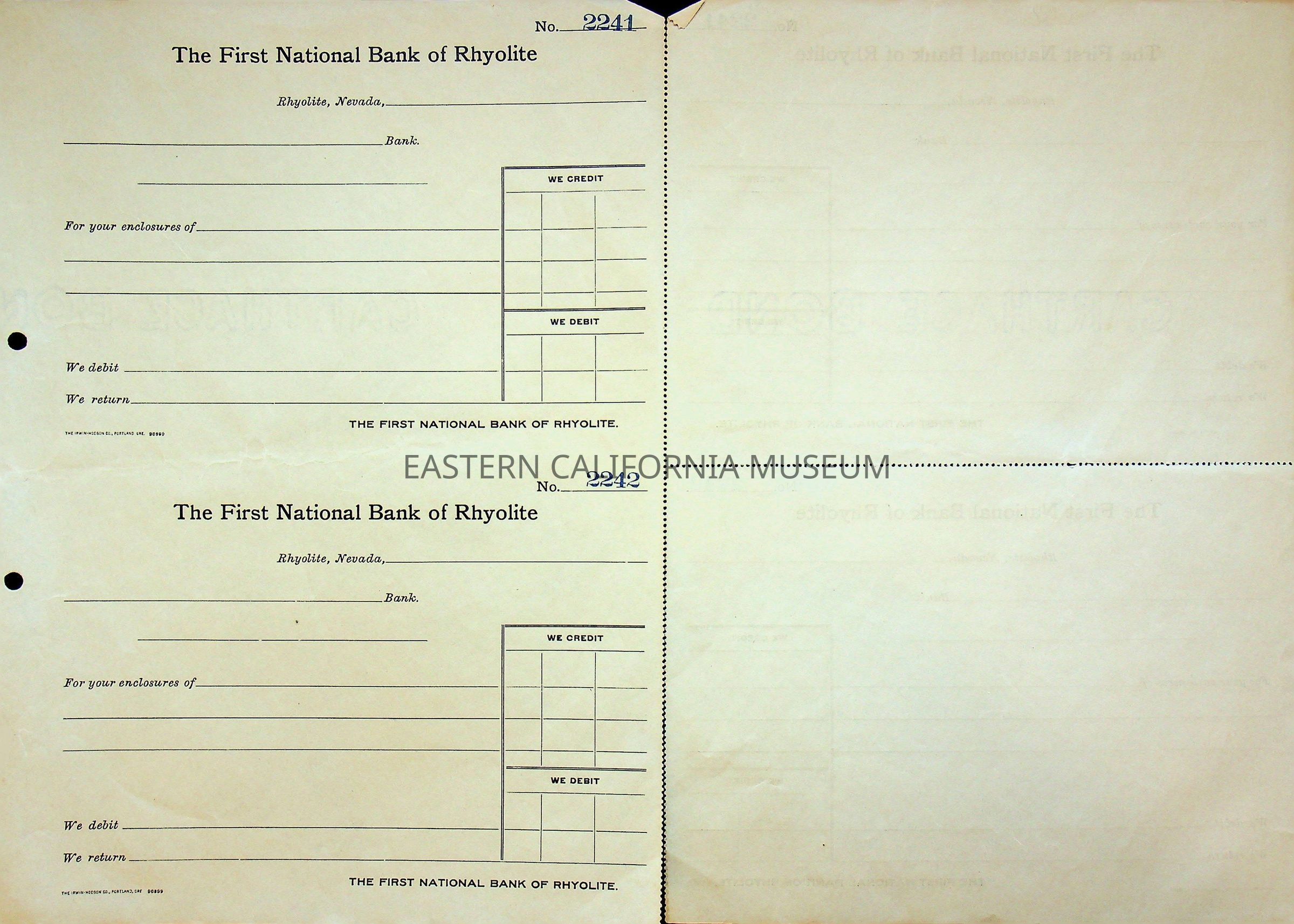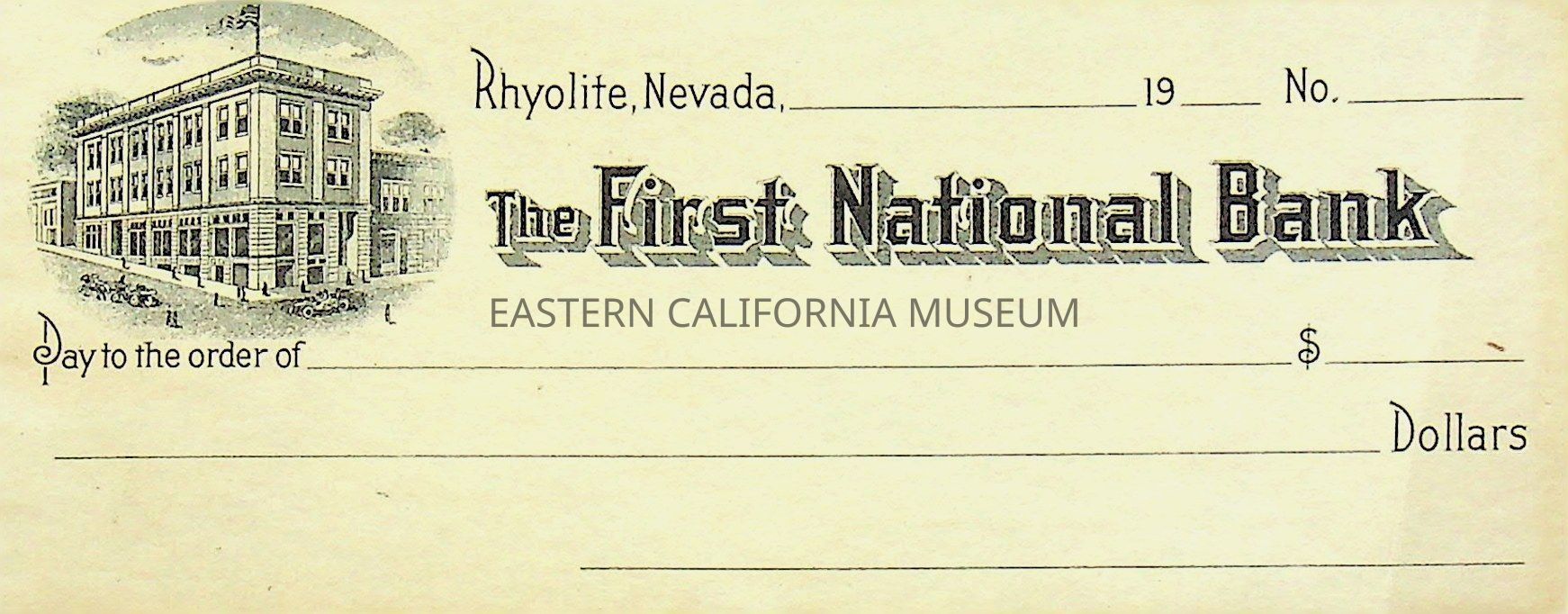 11. Blank check, First National Bank, Rhyolite. Has an image of a building in the upper left corner.