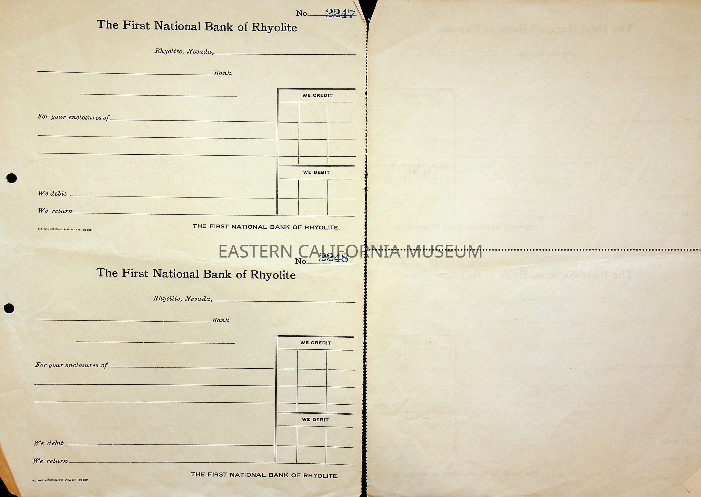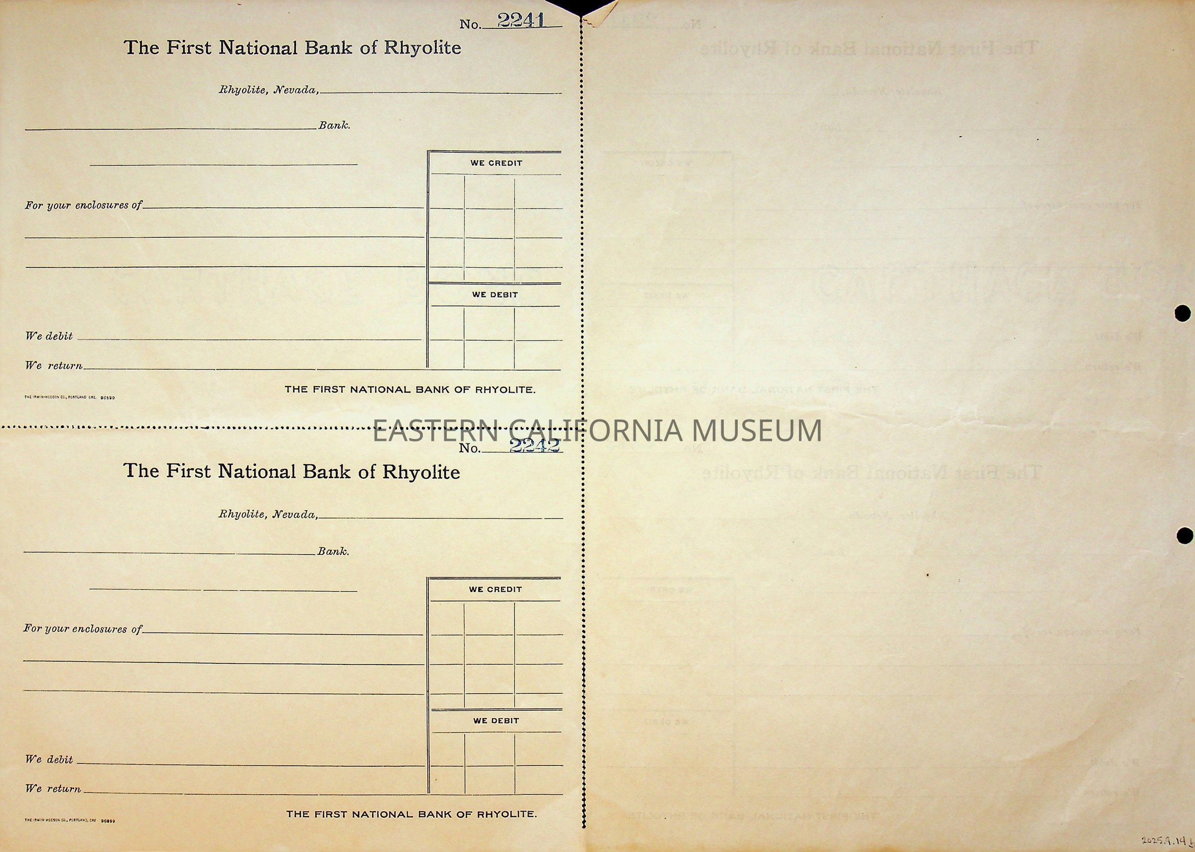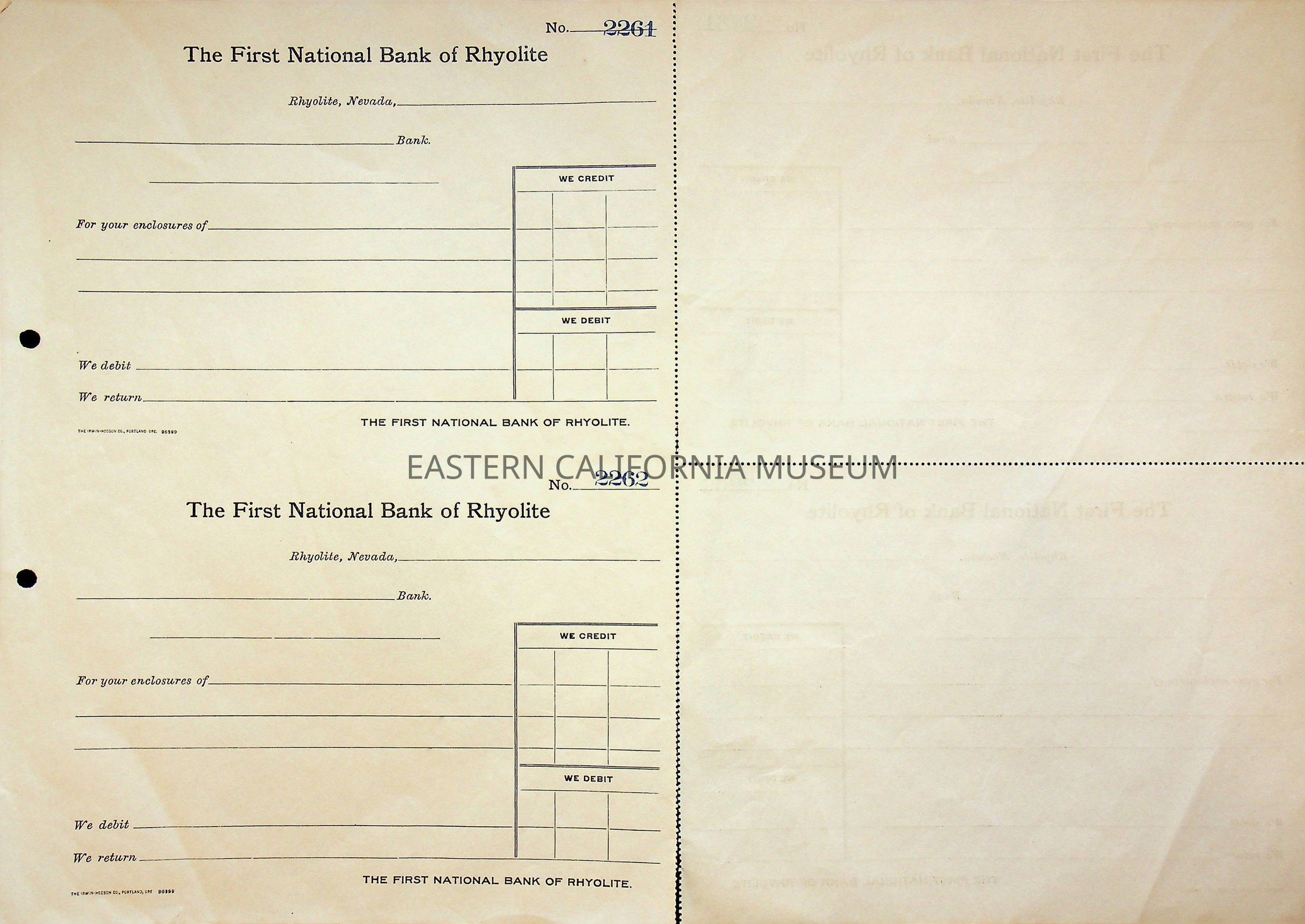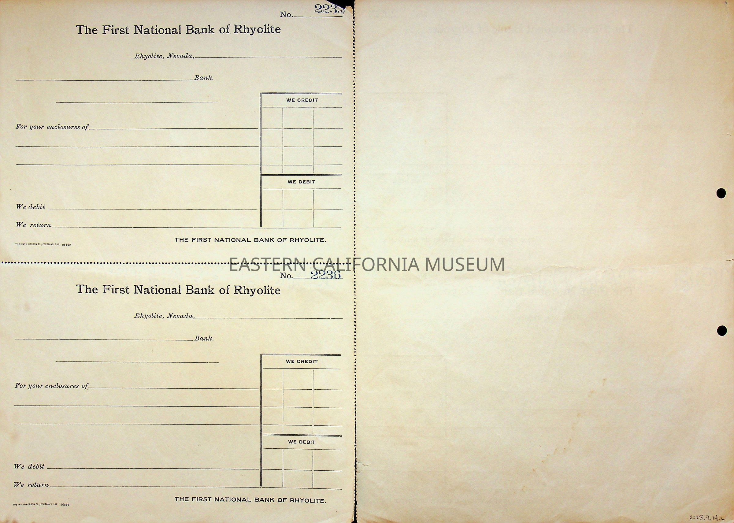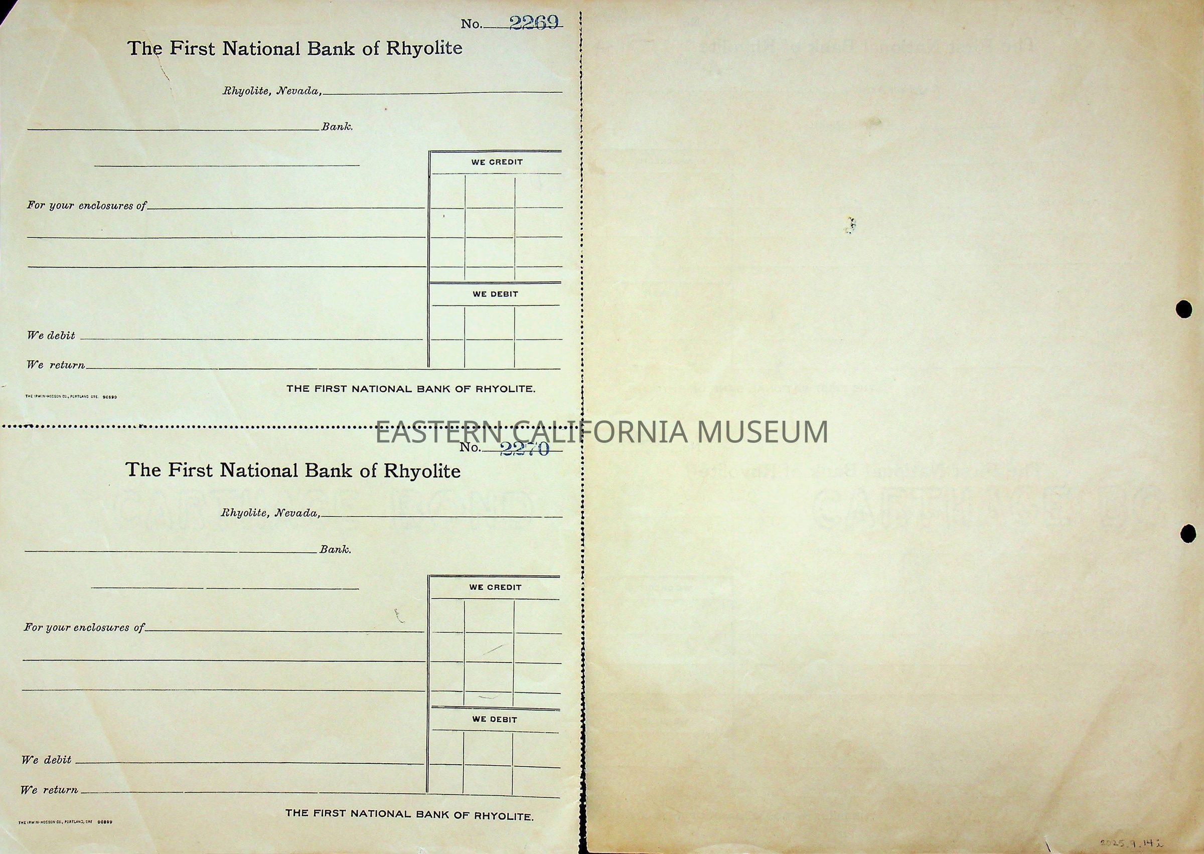 11. Blank check, First National Bank, Rhyolite. Has an image of a building in the upper left corner.