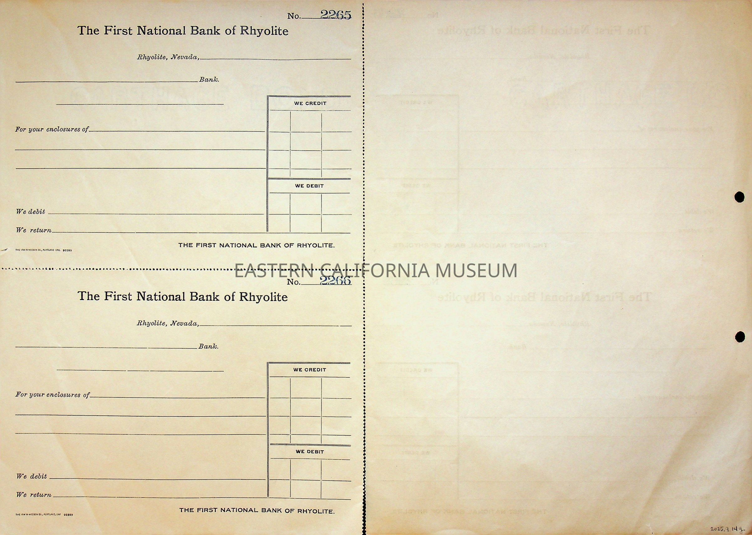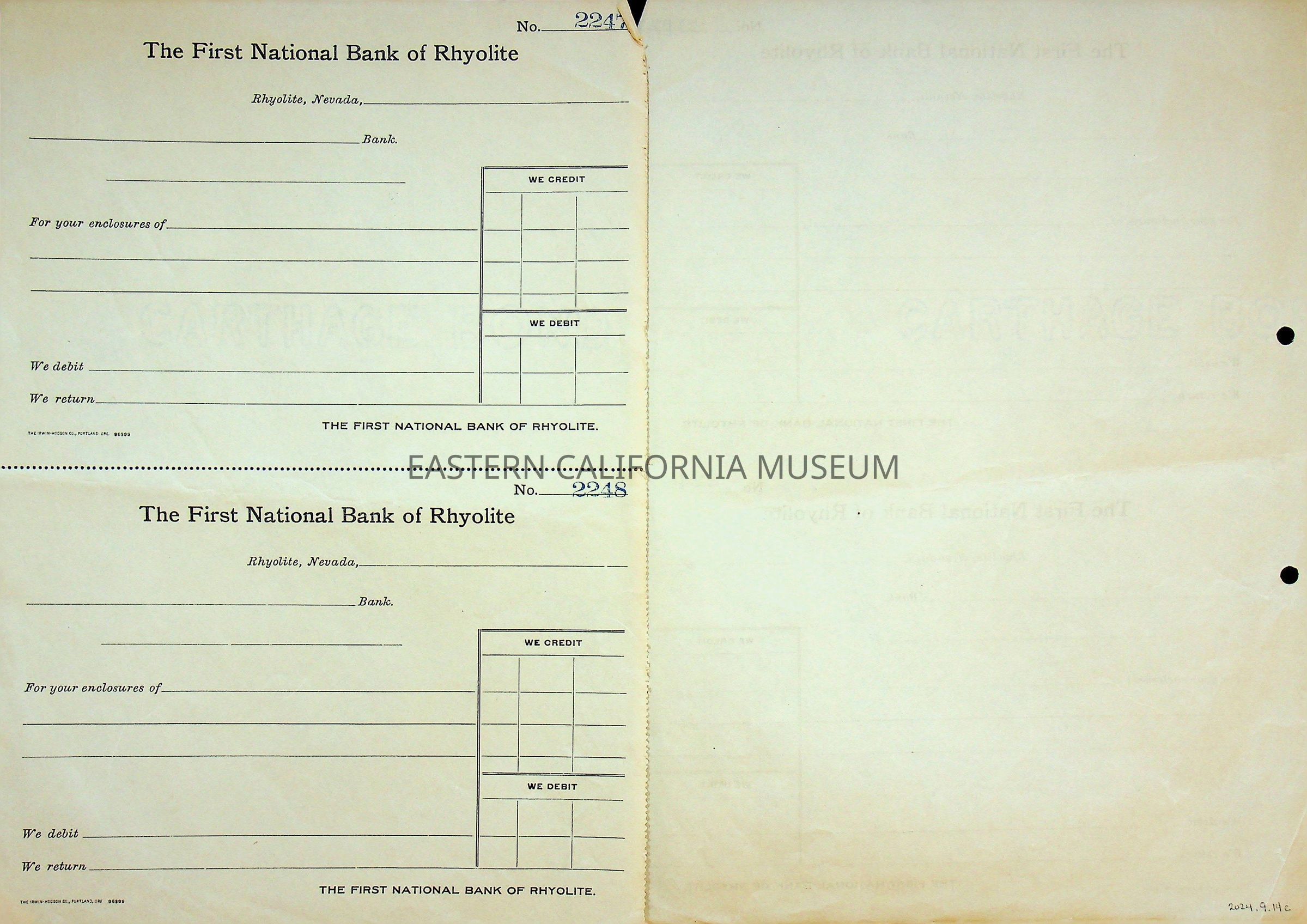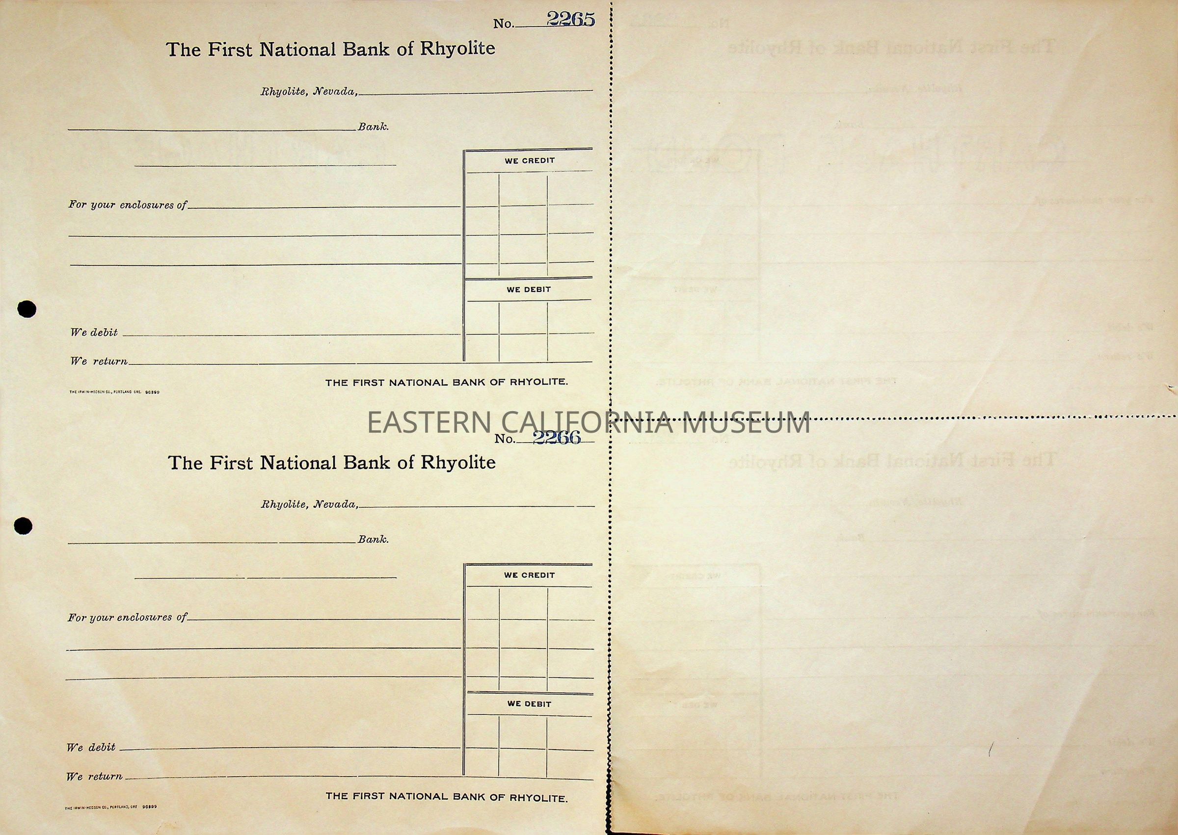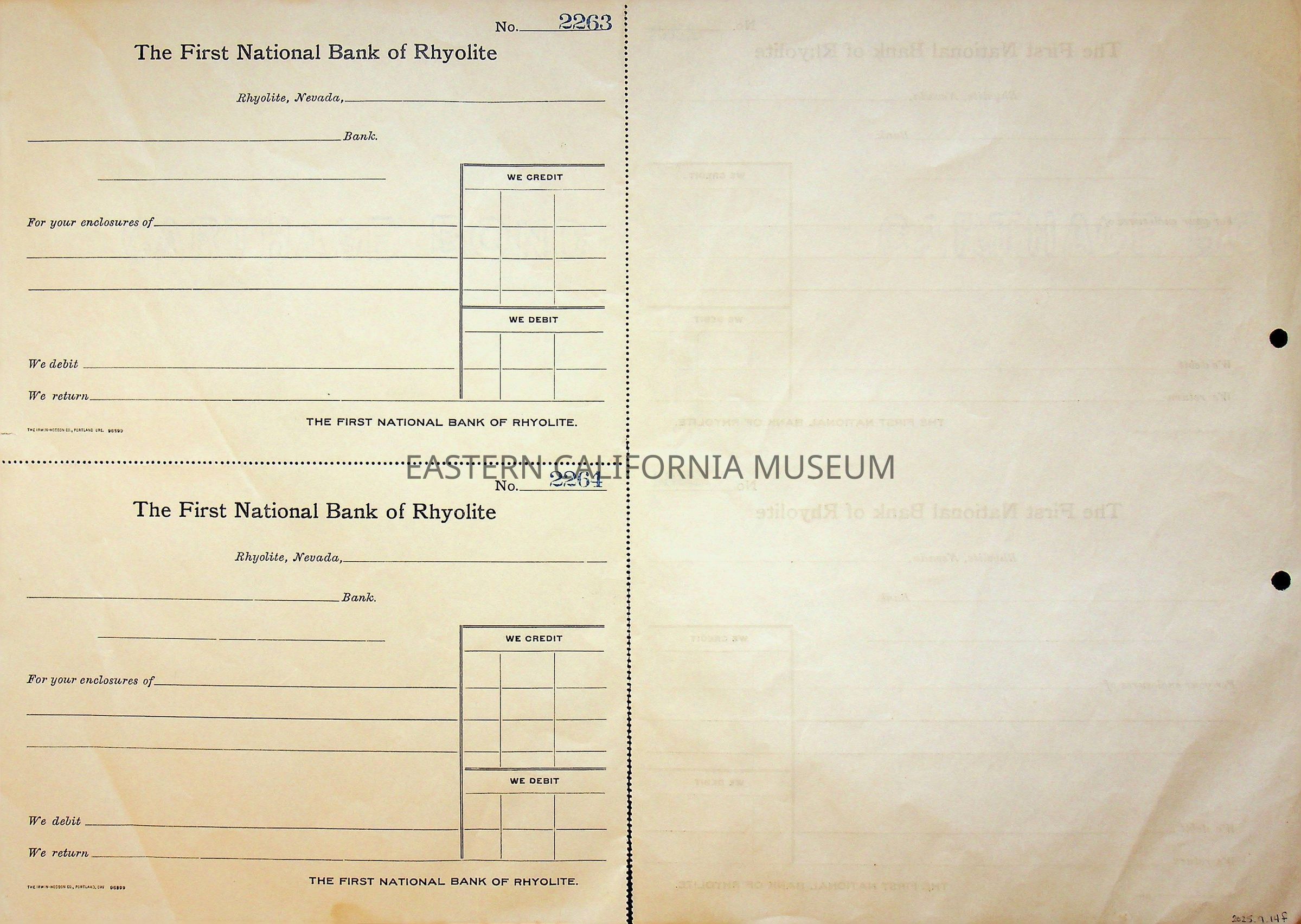 11. Blank check, First National Bank, Rhyolite. Has an image of a building in the upper left corner.