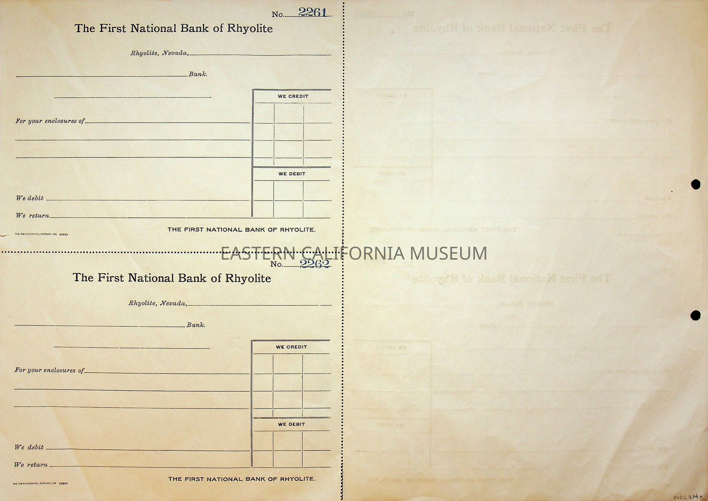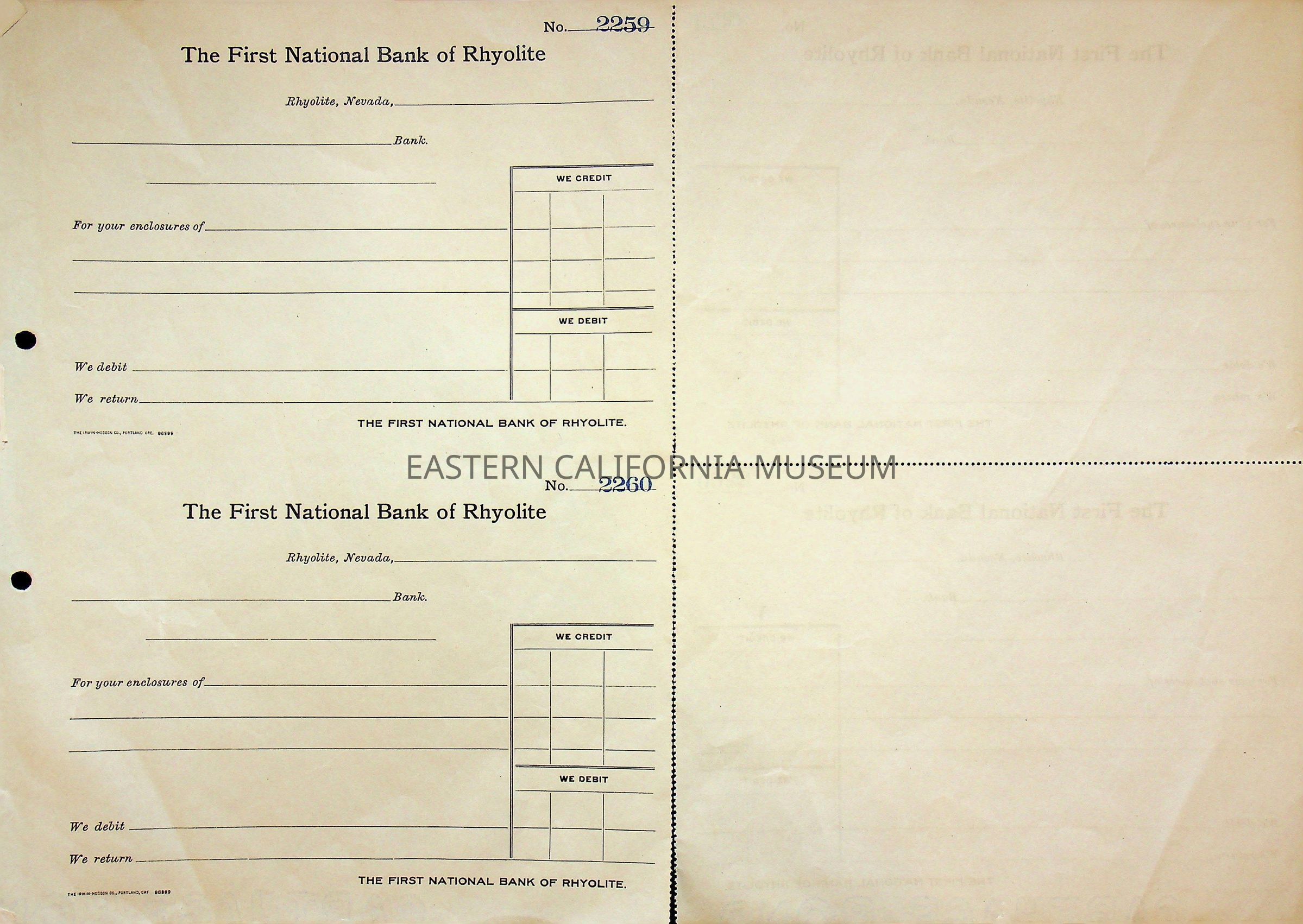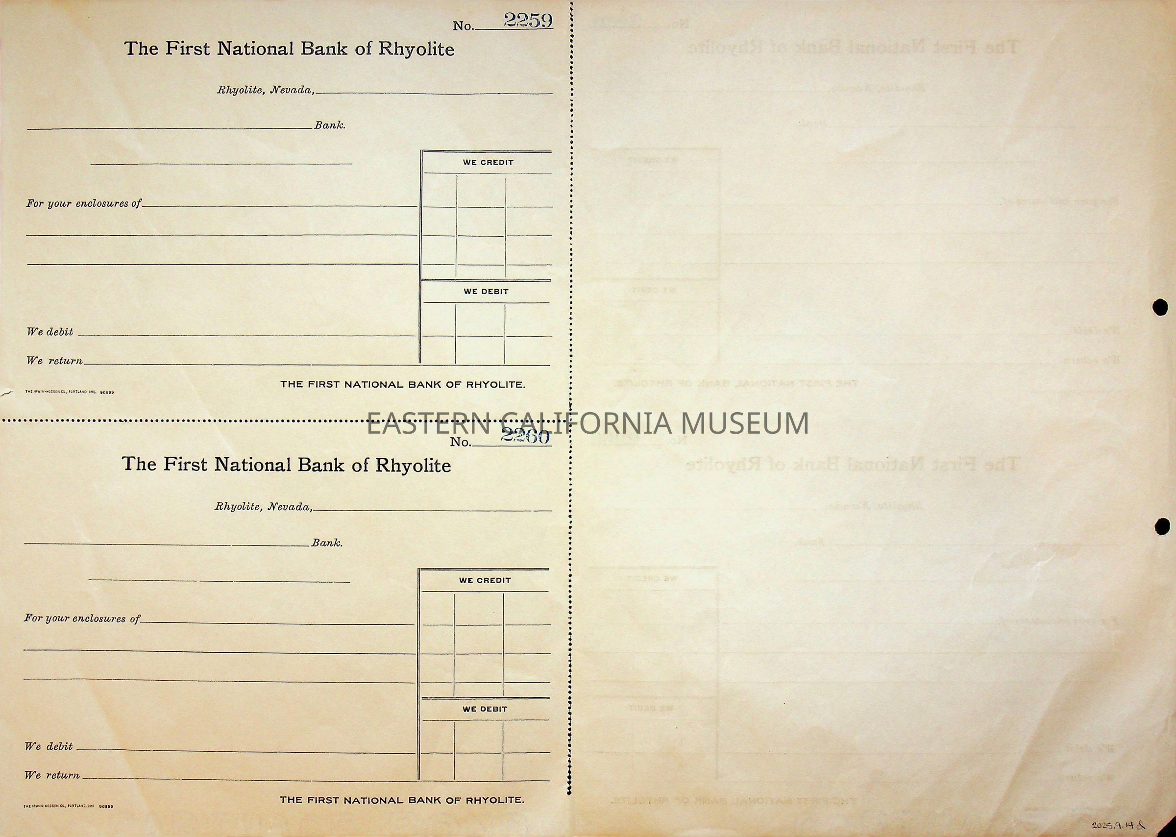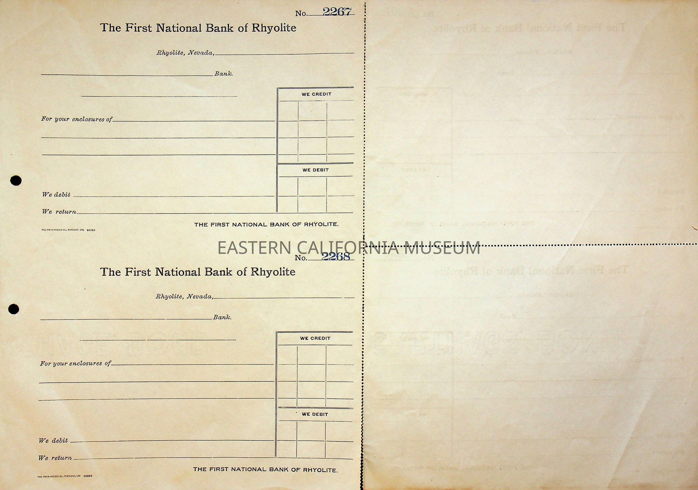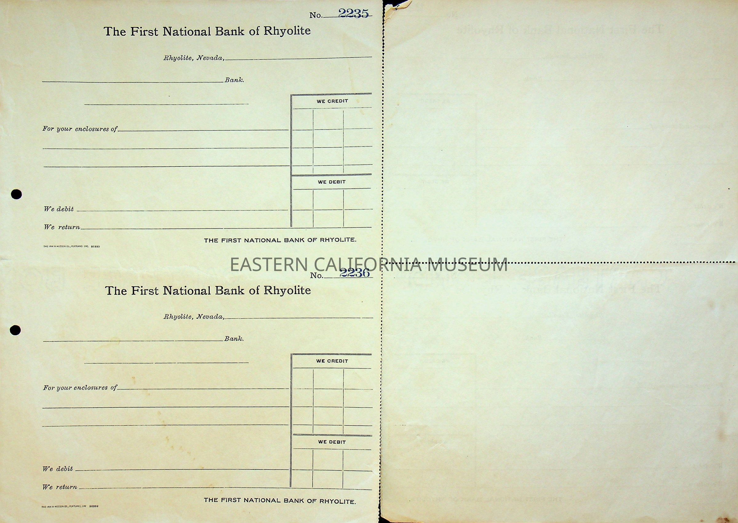 11. Blank check, First National Bank, Rhyolite. Has an image of a building in the upper left corner.