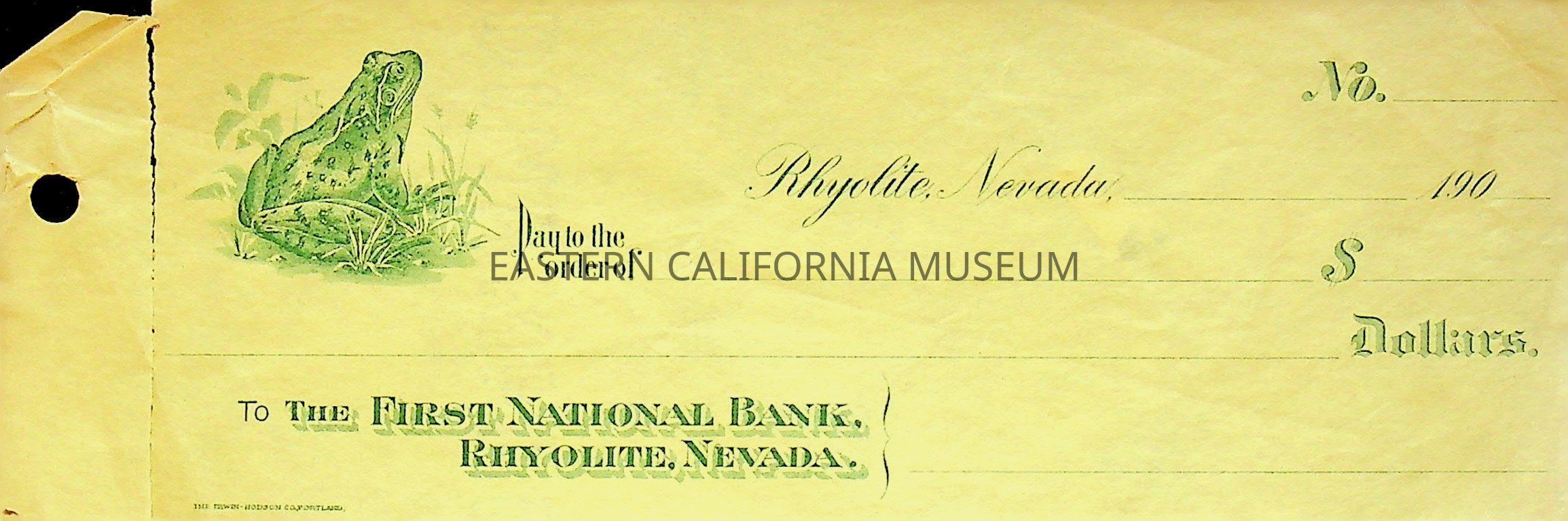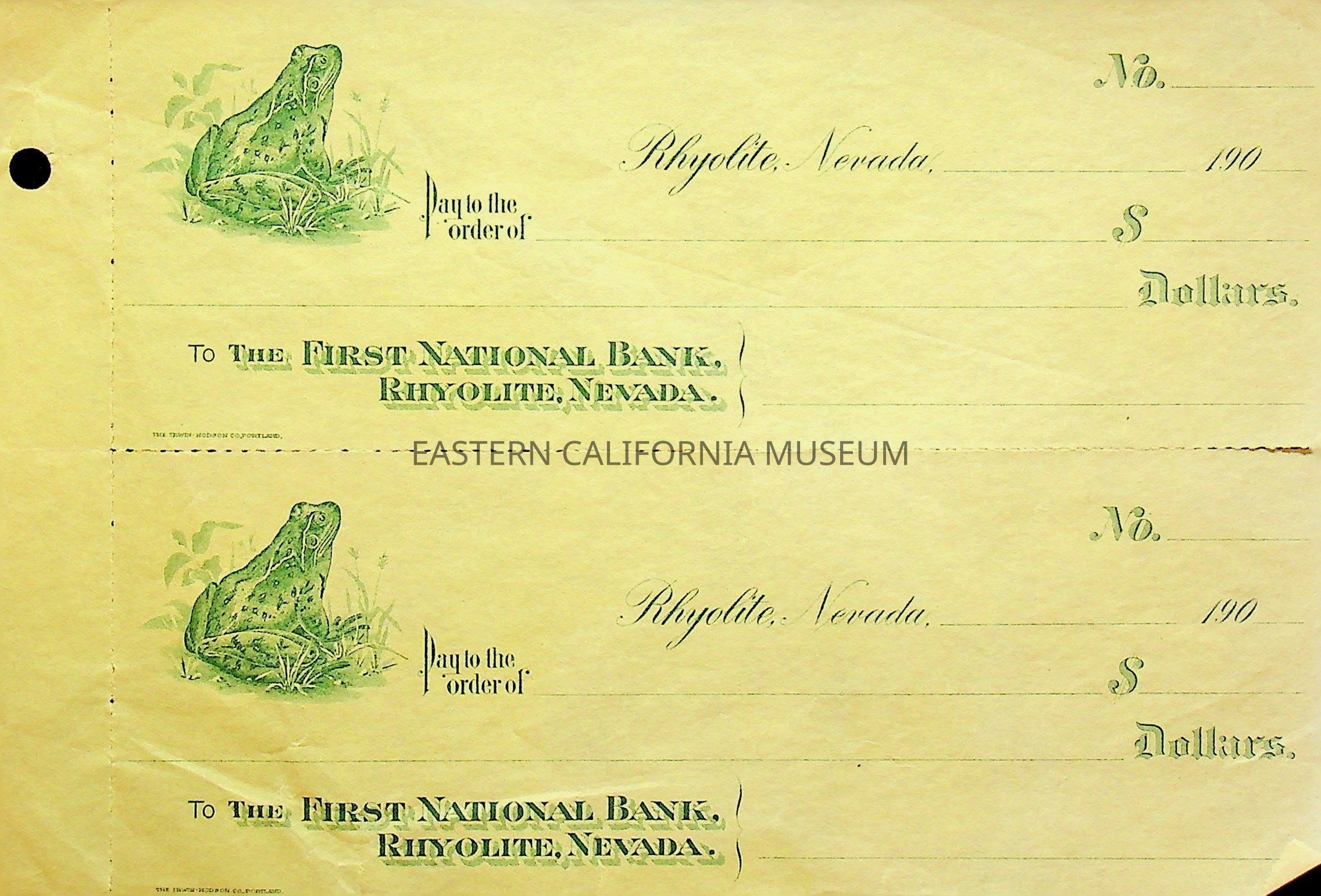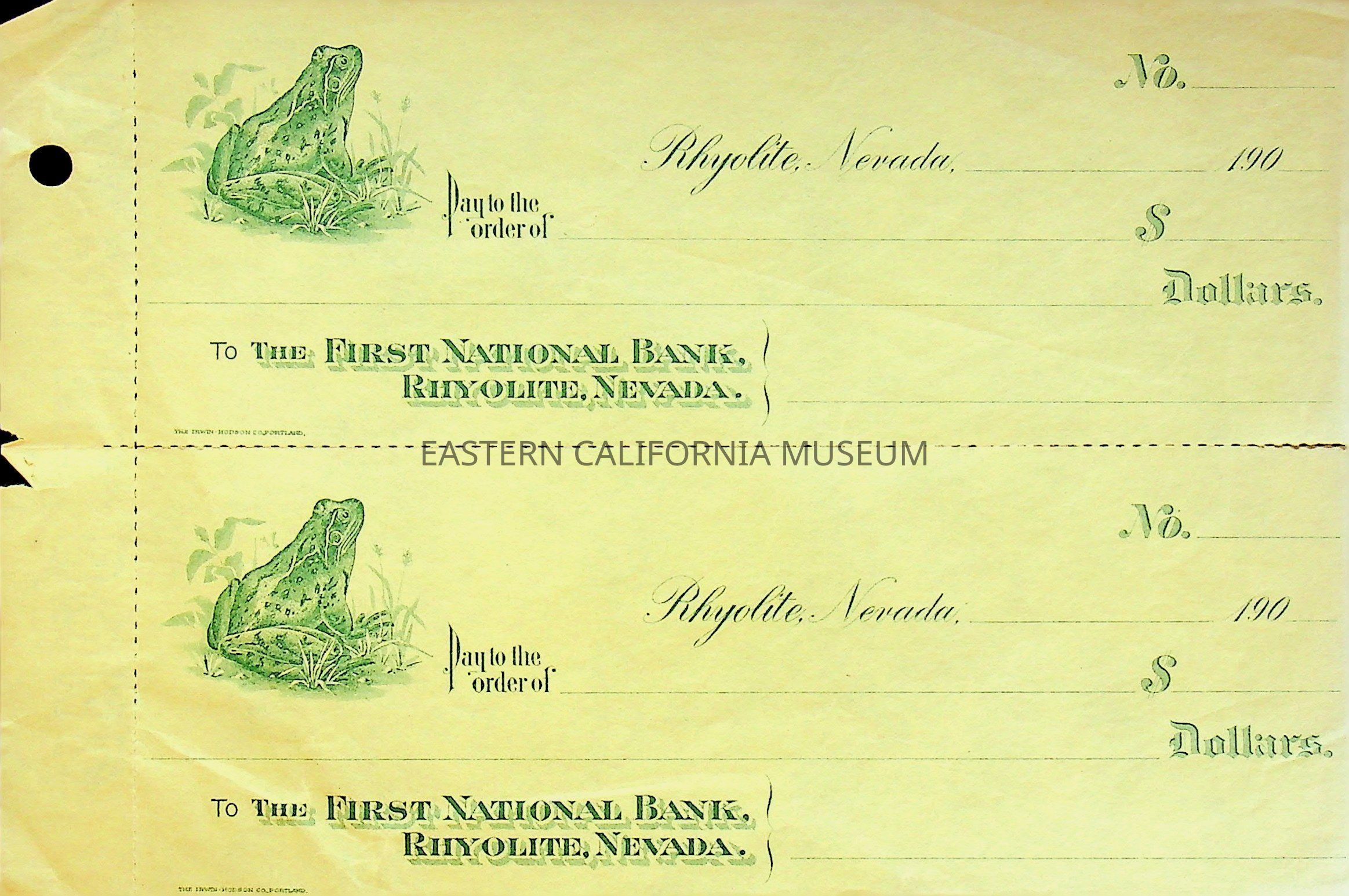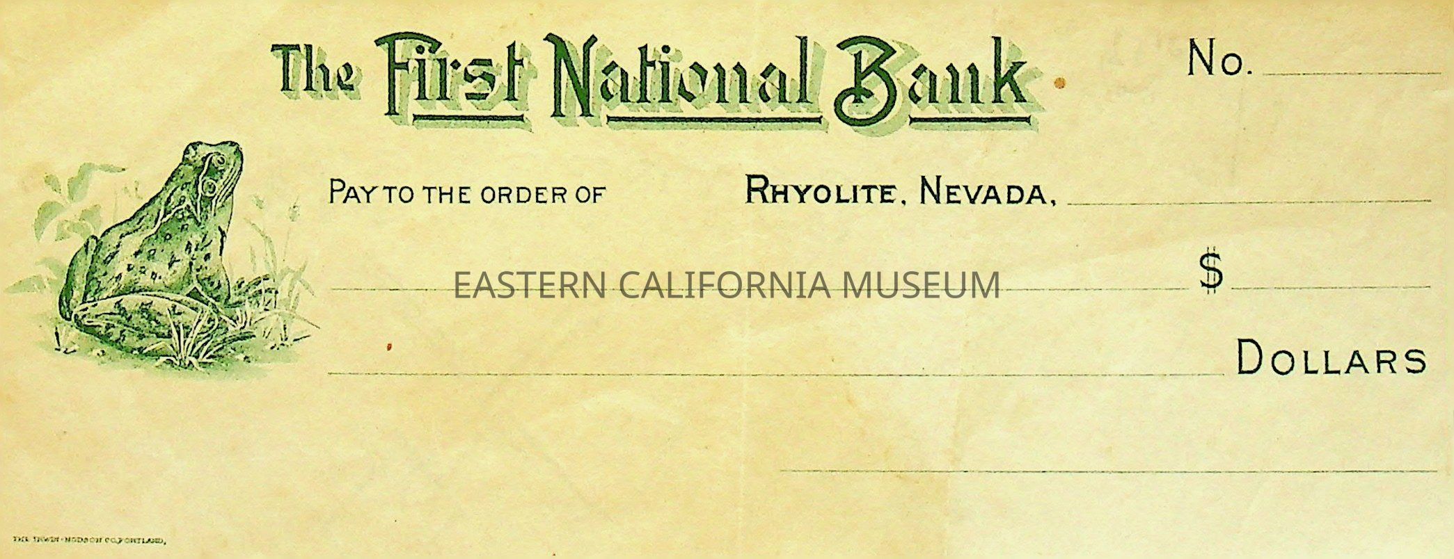 12. Blank check, First National Bank, Rhyolite. Has an image of a frog on the left side.