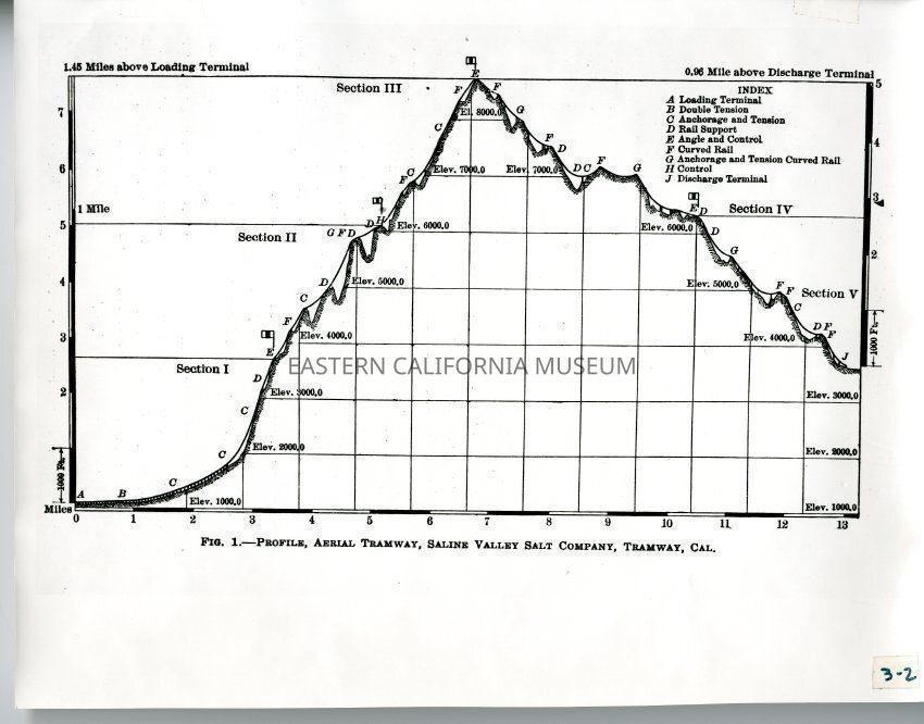 Graph or drawing of the elevation in feet and miles of the Saline Valley Salt Company tram. It is labeled: Fig. 1: Profile, aerial tramway, Saline Valley Salt Company, Tramway, Cal.