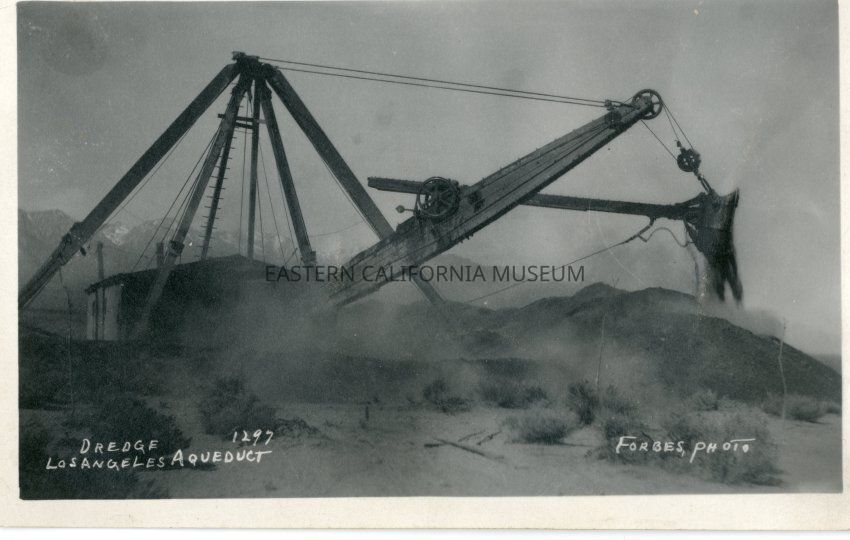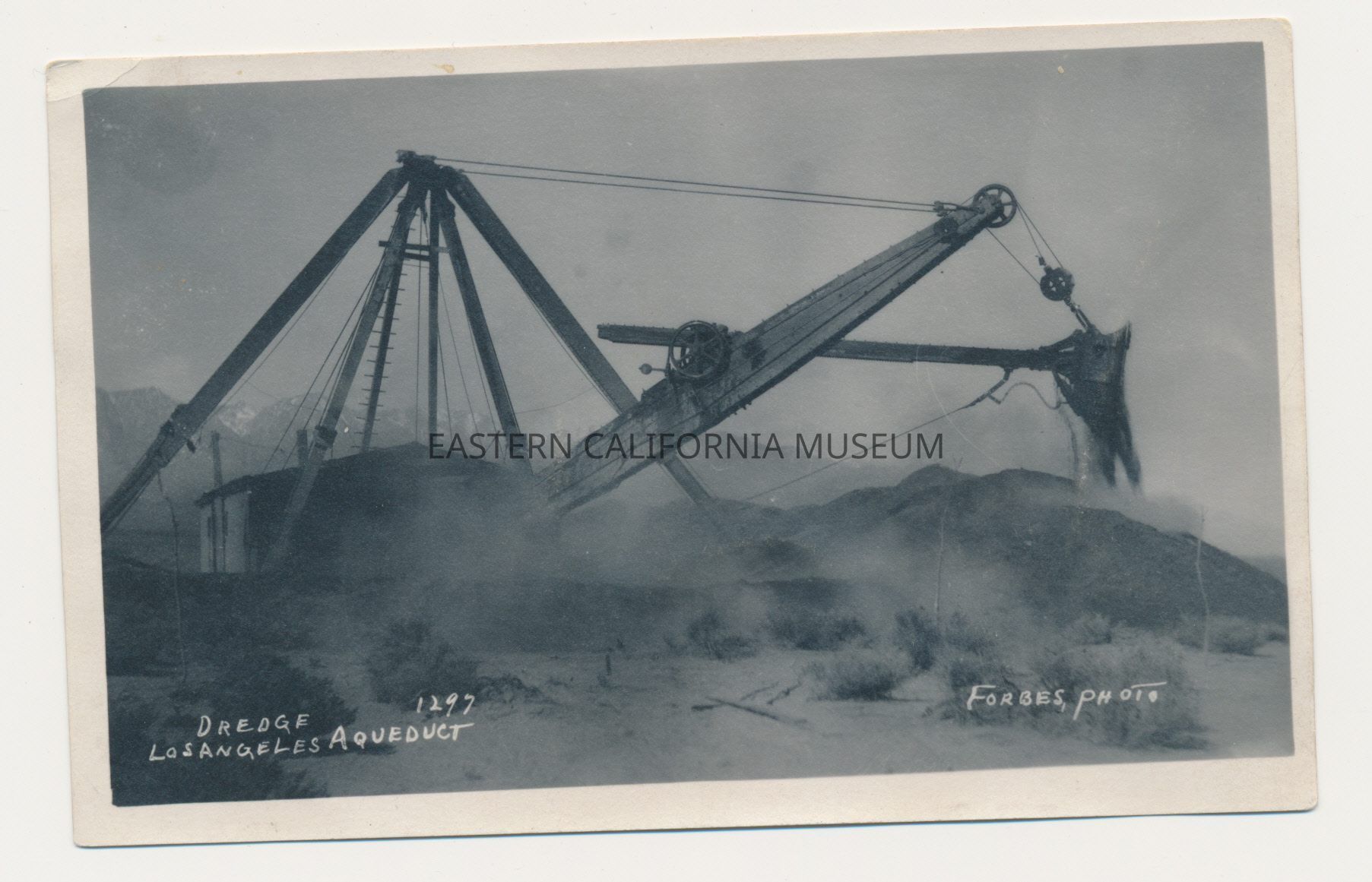 Photo postcard of an electric-powered dipper dredge constructing a channel on an open, lined section of the L.A. Aqueduct. It is titled, "Dredge Los Angeles Aqueduct" and was taken by photographer A. A. Forbes, who gave it his ID #1297.Collection