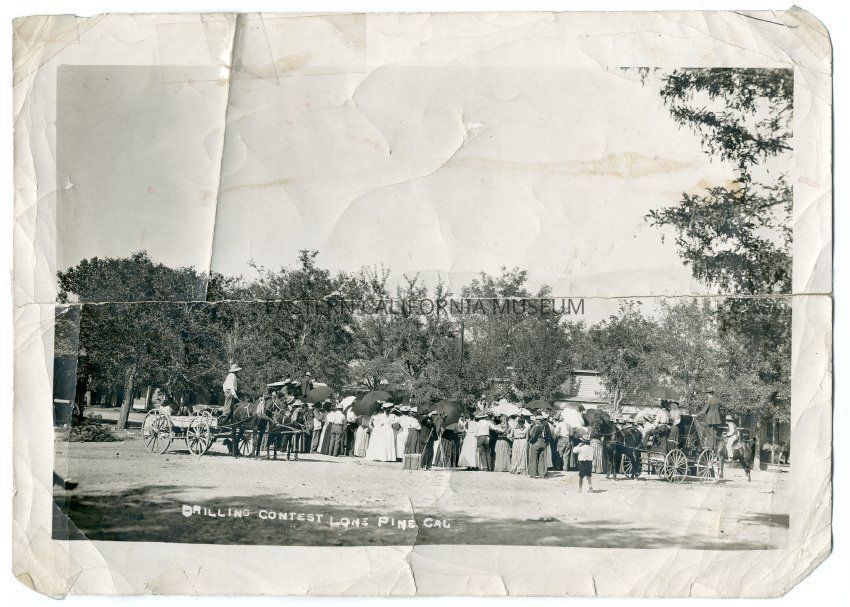 Photo titled, "Drilling contest, Lone Pine, Cal." It was likely taken by photographer F. G. Harvey. It shows a crowd of people (men, women, and children) standing in a dirt street in Lone Pine. A couple of wagons are parked on the outside of the crowd with more people standing on them to get a view of the drilling contest.Photograph Details