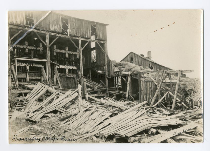 Photo of the remains of an old stamp mill building. Written in black ink at bottom is "Dunderber Mine Ruins" and "Frashers." The top left corner is bent.