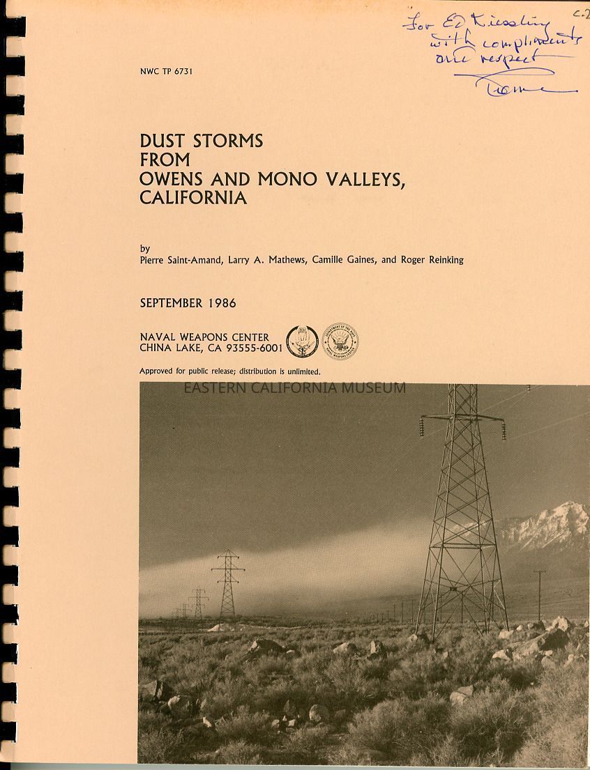 "Dust Storms from Owens and Mono Valleys, California" has identifier "NWC TP 6731" and is spiral bound.