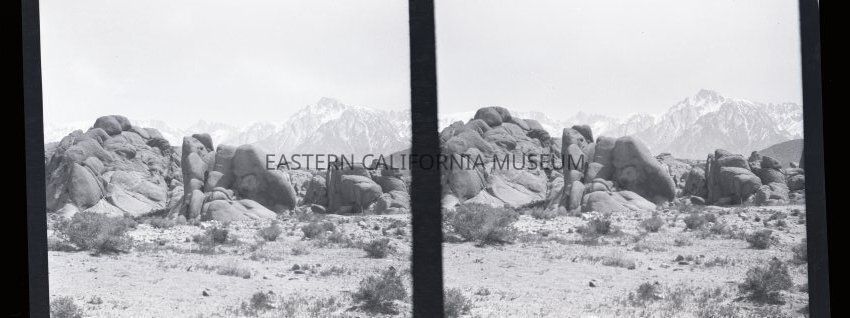 Negative of a stereoscopic image of Alabama Hills with snow-capped Sierra Nevada mountain range in background.