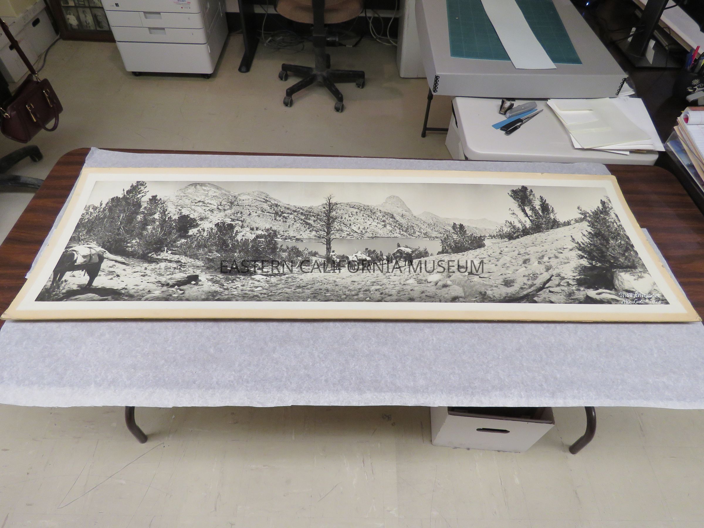 Photo of a packtrain in front of Rae Lake and Fin Dome. Signed by Matt A. Wolfskill, 1910. Same photo as 1993.45.231 and 1993.45.288.Made/Created