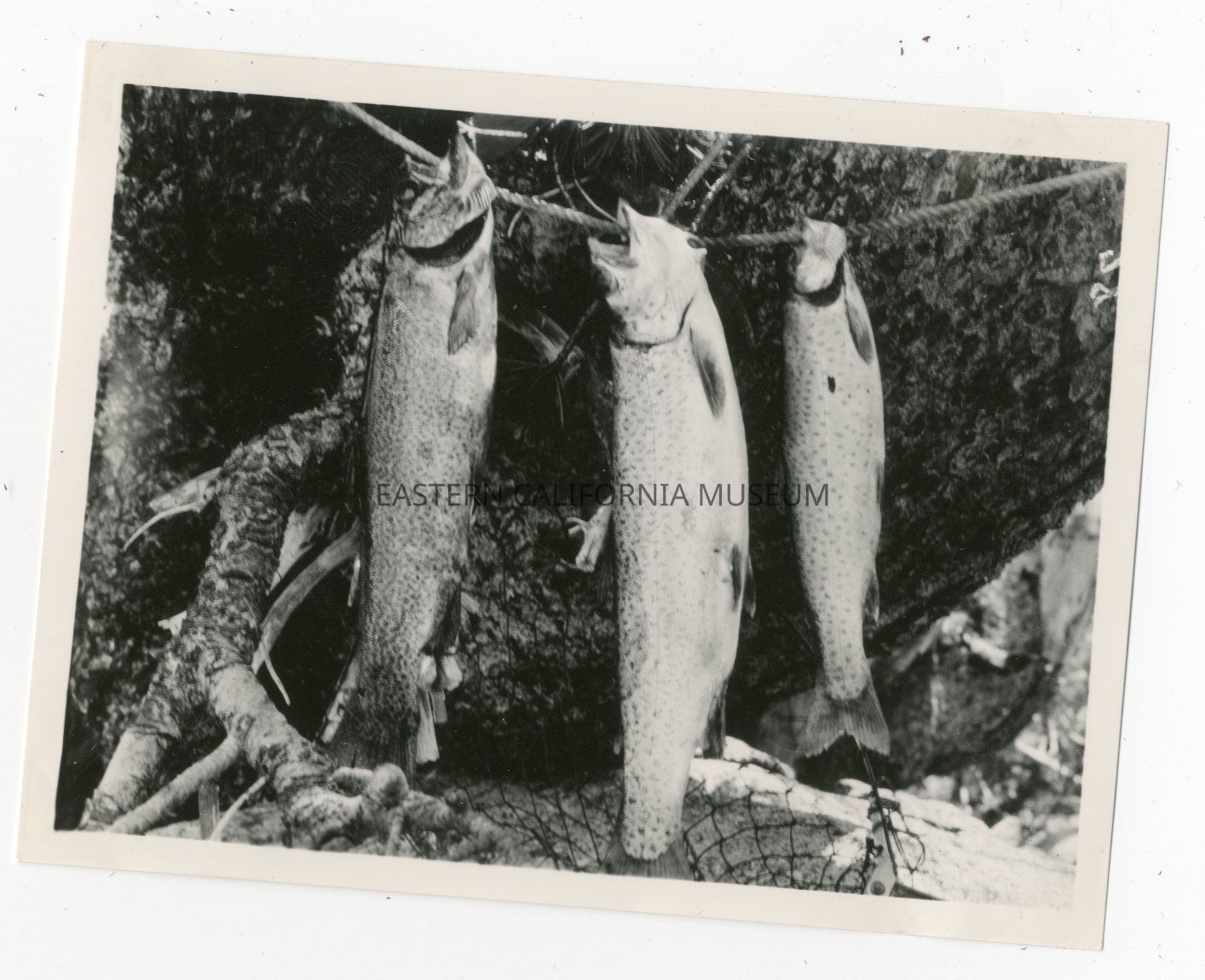 Photo of three caught trout on a stringer hanging in a tree.