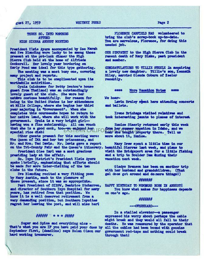The "Whitney Peeks" newsletter published by the Southern Inyo Business and Professional Women's Club. This one is identified as, "Vol. II, No. IV" and "August 27, 1959." Three letter sized pages all of which are a blue-green color.Collection