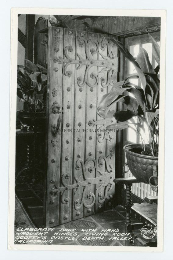 Photo postcard of Death Valley Scotty's Castle. It is labeled, "Elaborate Door with Hand Wrought Hinges, Living Room, Scotty's Castle, Death Valley, California."Collection