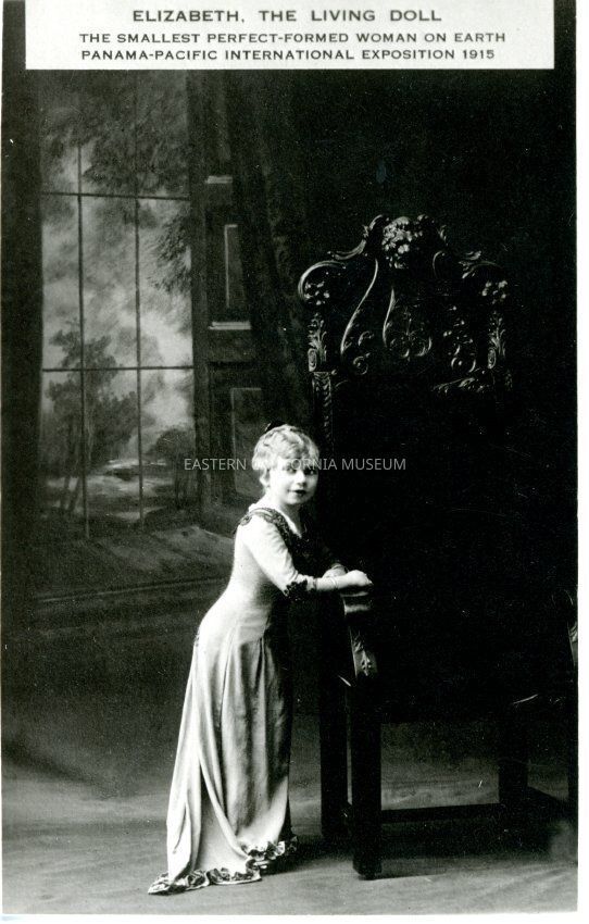 Photo postcard labeled, "Elizabeth, the Living Doll: The smallest perfect-formed woman on earth. Panama-Pacific International Exposition, 1915." From the Studios of R. P. Whigham of San Francisco.
