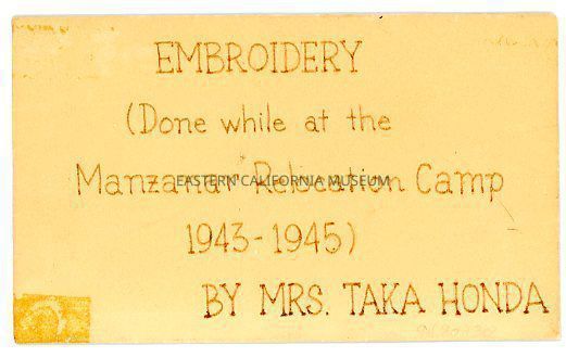 Handwritten label says: EMBROIDERY (Done while at the Manzanar Relocation Camp 1943-1945) By Mrs. Taka Honda.Collection