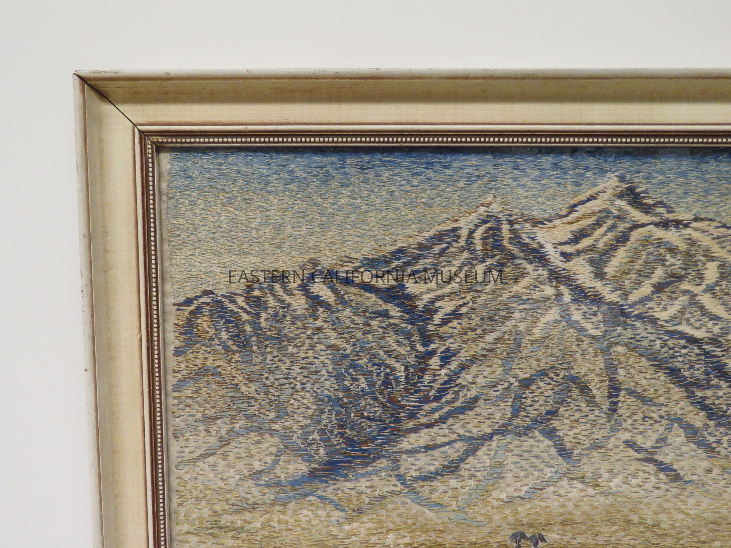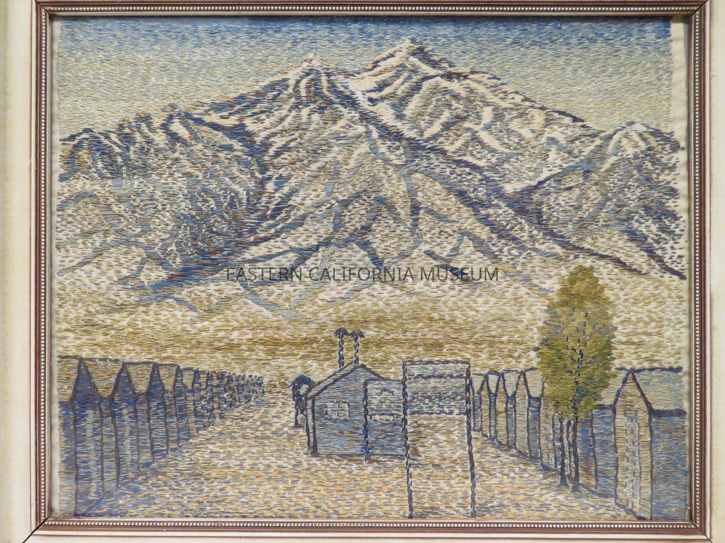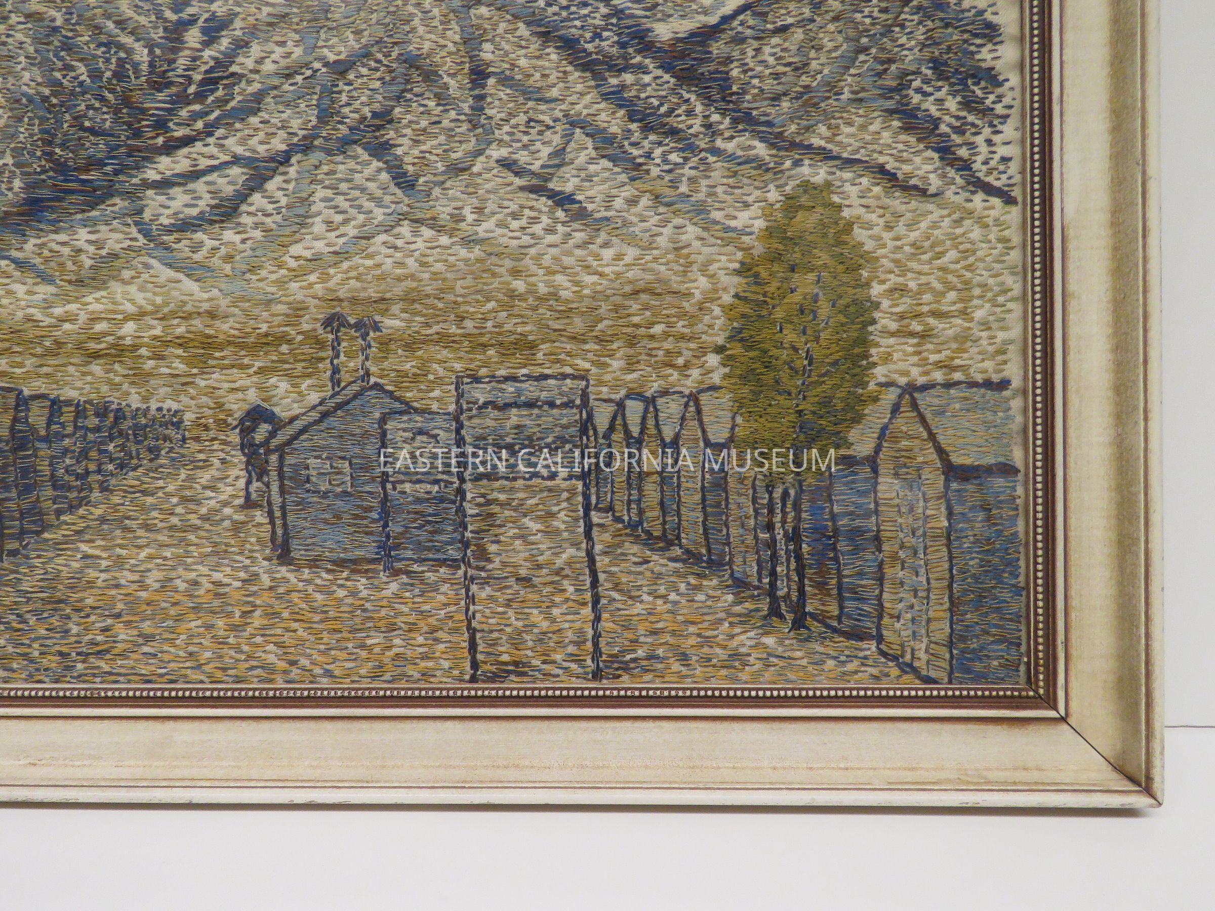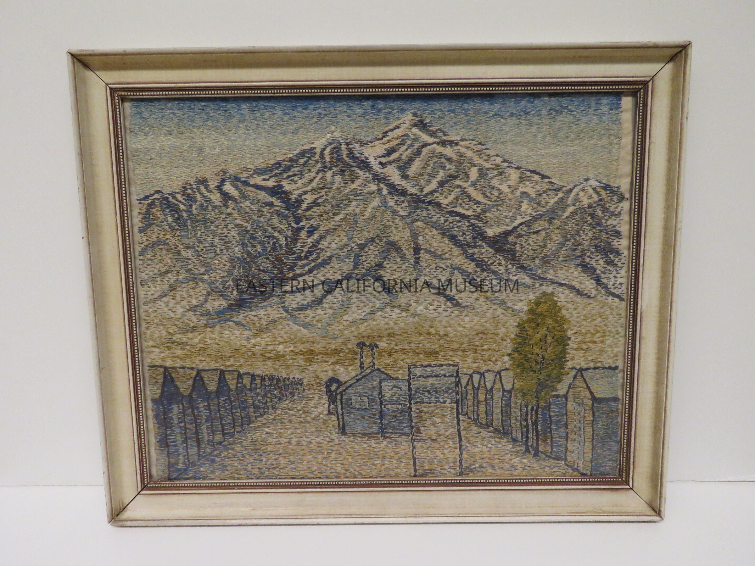 A framed embroidery created by Taka Honda while interned at Manzanar War Relocation Center from 1943-1945. It is a scene of Manzanar War Relocation Center with Mt. Williamson in the background. There are two rows of barracks with a sign (or basketball backboards?) and single building in the center. The colors of thread used include blues, greens, white, and earth tones.