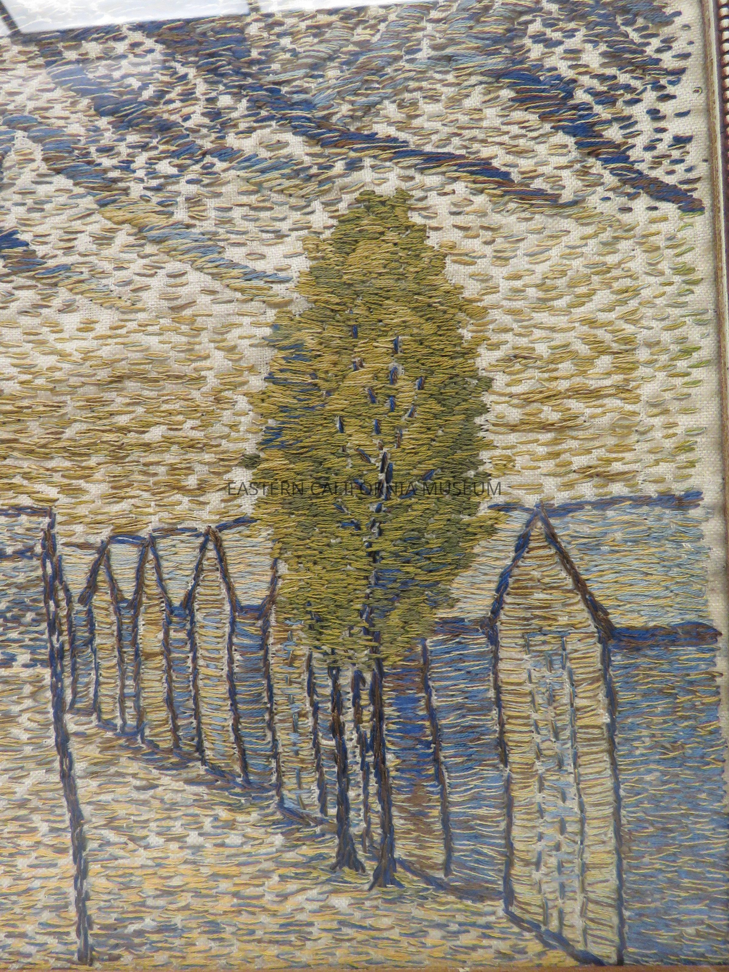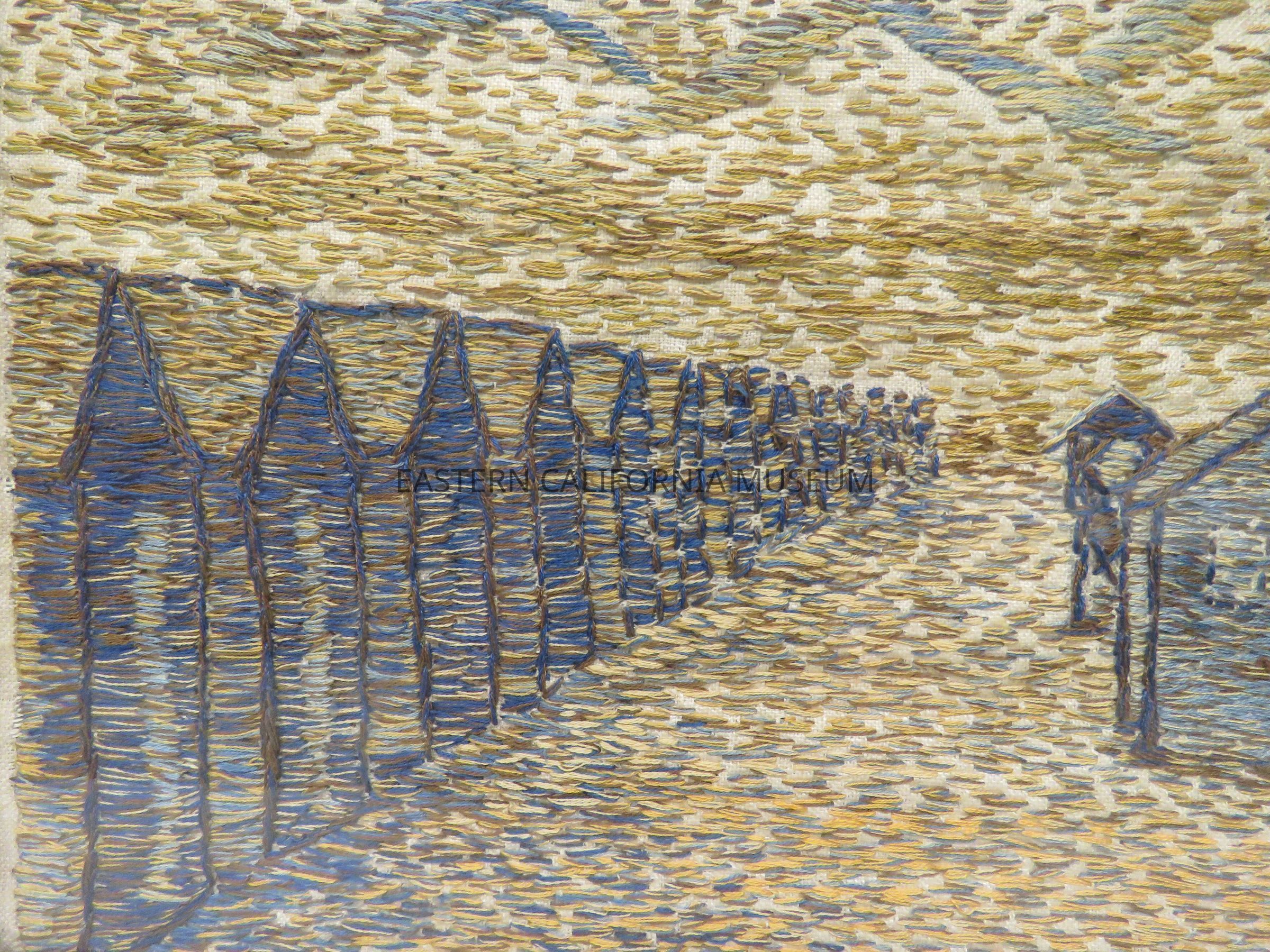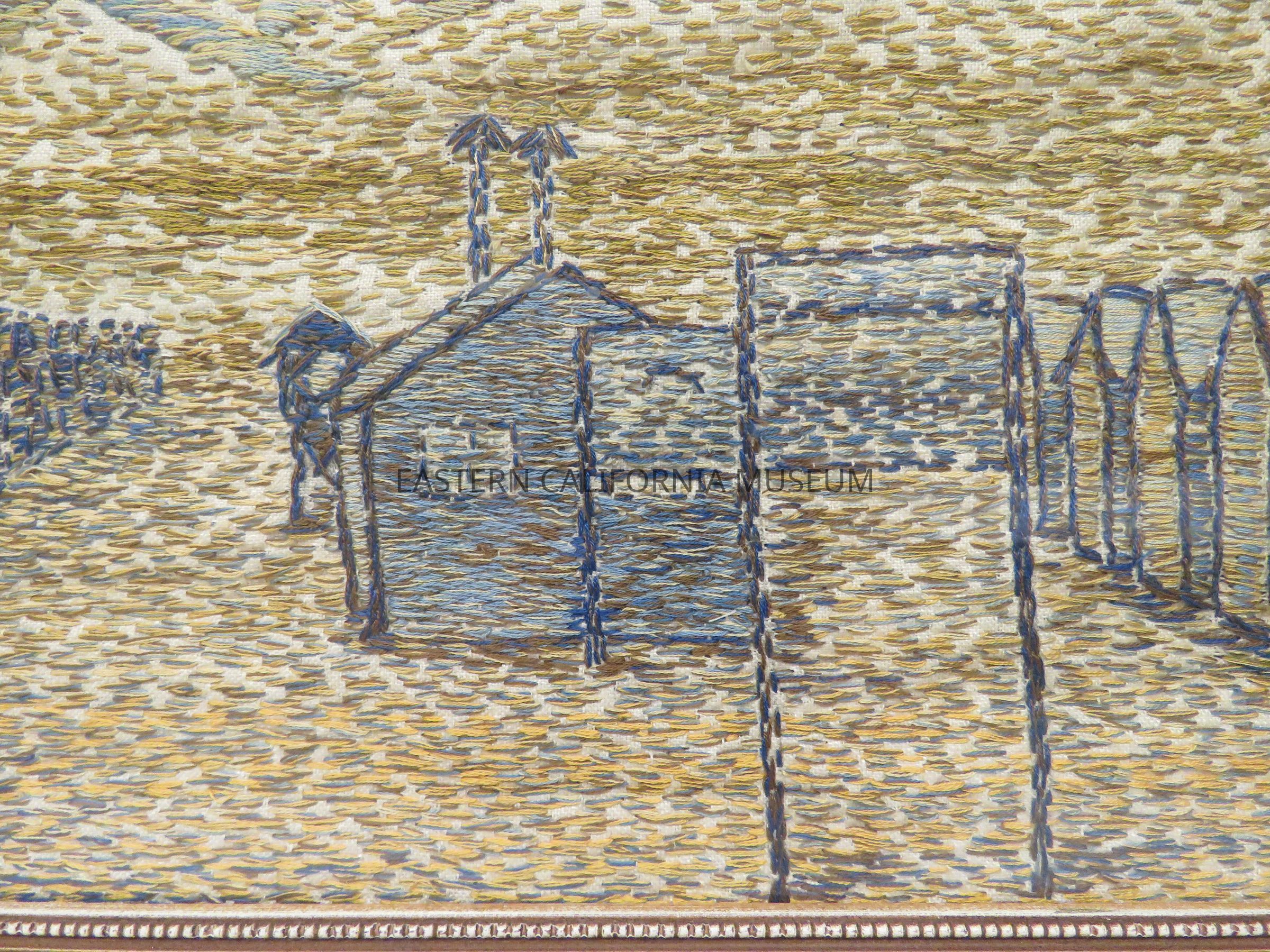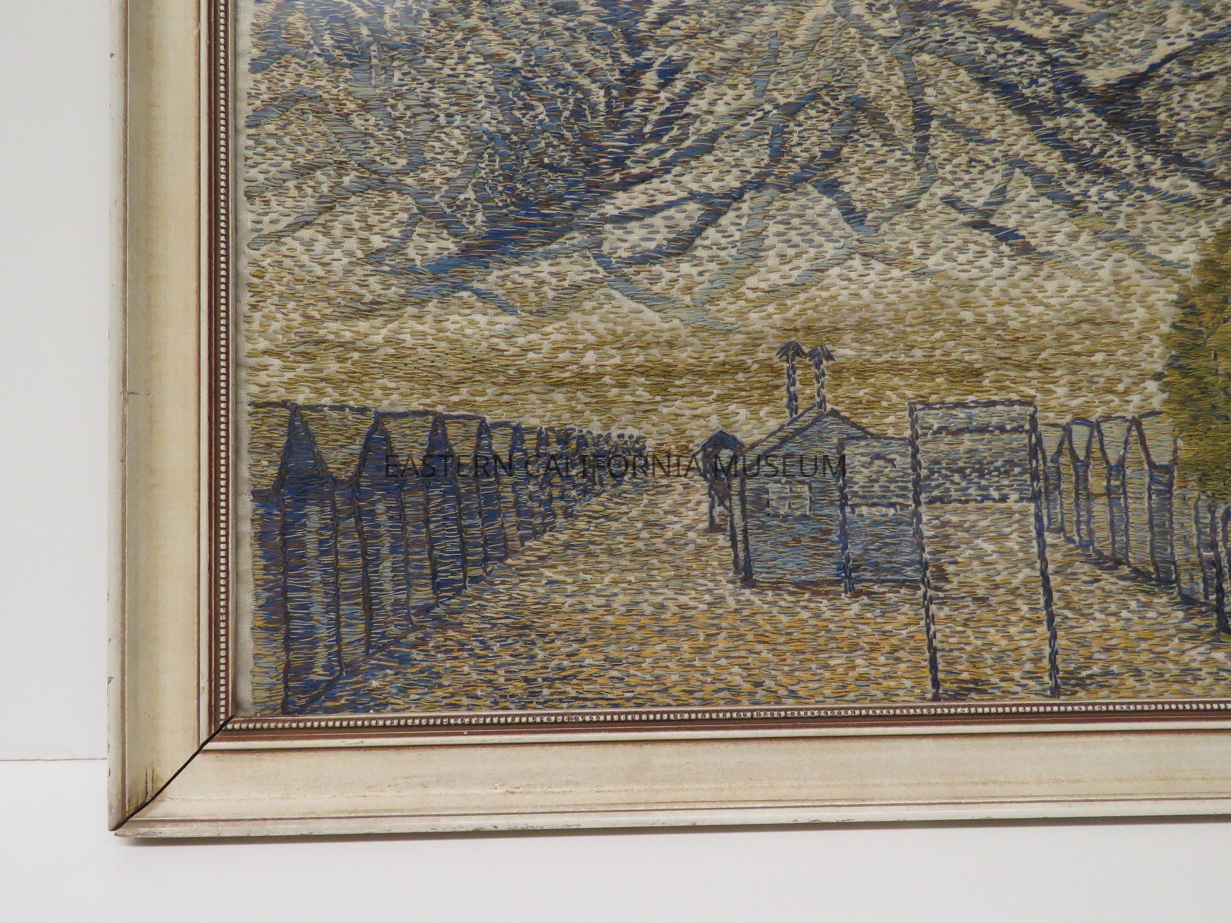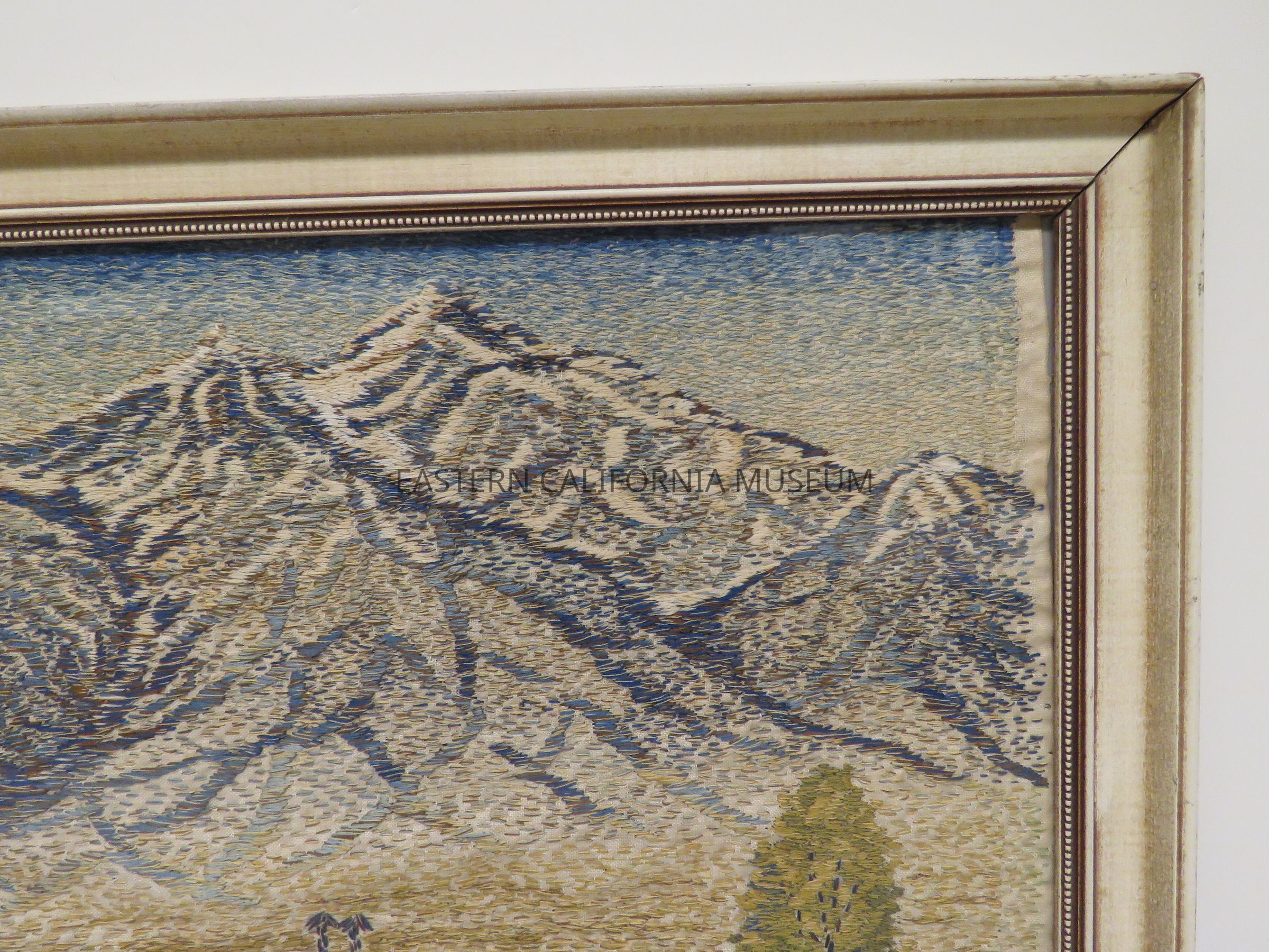 A framed embroidery created by Taka Honda while interned at Manzanar War Relocation Center from 1943-1945. It is a scene of Manzanar War Relocation Center with Mt. Williamson in the background. There are two rows of barracks with a sign (or basketball backboards?) and single building in the center. The colors of thread used include blues, greens, white, and earth tones.
