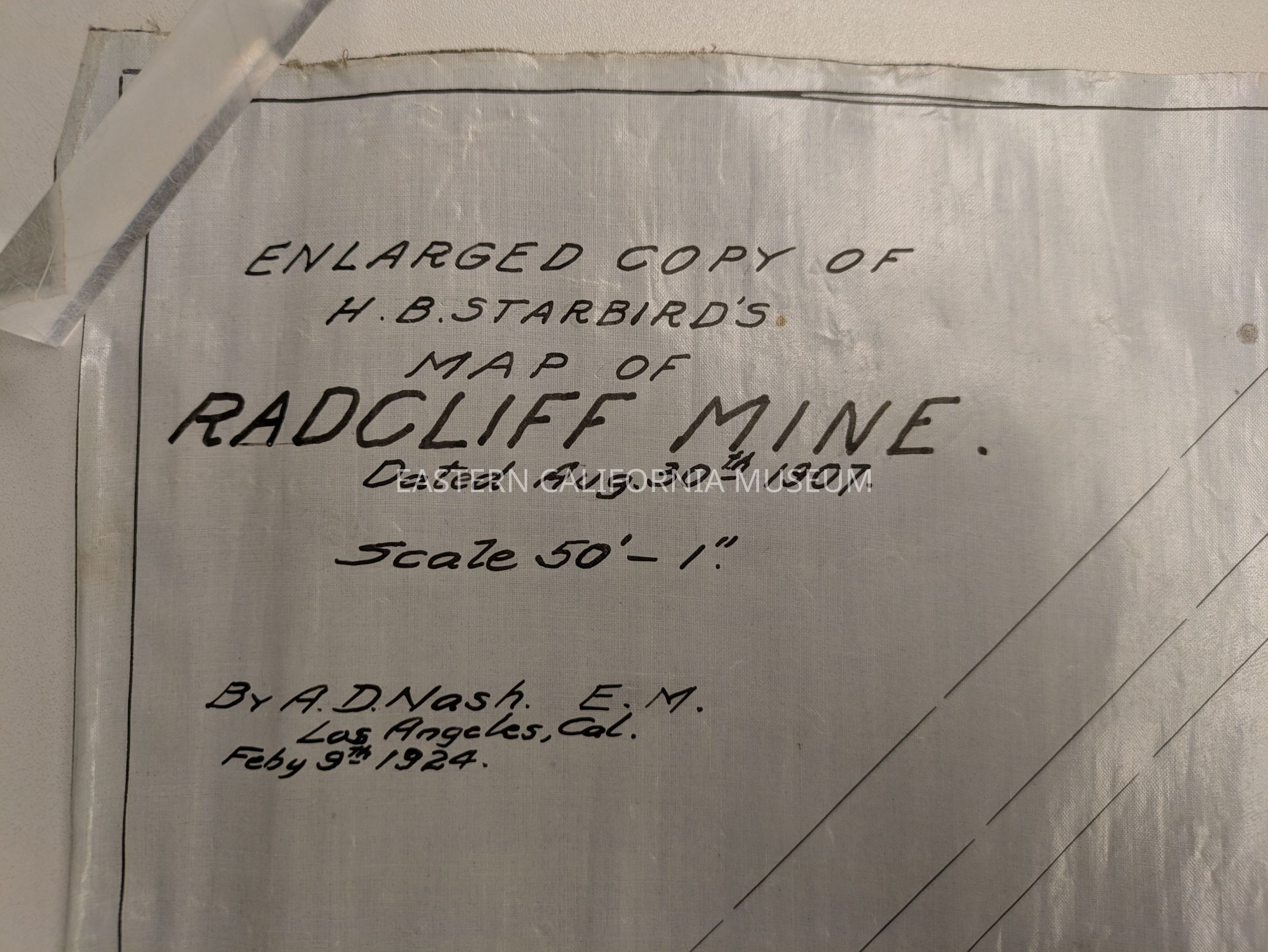 This appears to be a hand-drawn vertical projection map on oilcloth (or some other water-repellent material). The original map was drawn by H. B. Starbird in 1907, but this enlarged copy was completed by A. D. Nash in 1924.Collection