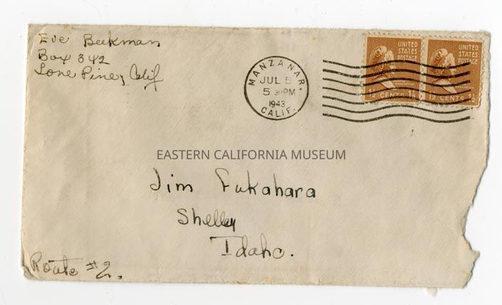 Envelope postmarked Manzanar, Calif. and dated 07/05/1943. It has two 1 1/2 Martha Washington stamps (brown/orange color). It was sent from Eve Beekman (Lone Pine address) to Jim Fukahara [Fukuhara] in Shelley, Idaho. "Route #2" written in lower left corner.Collection