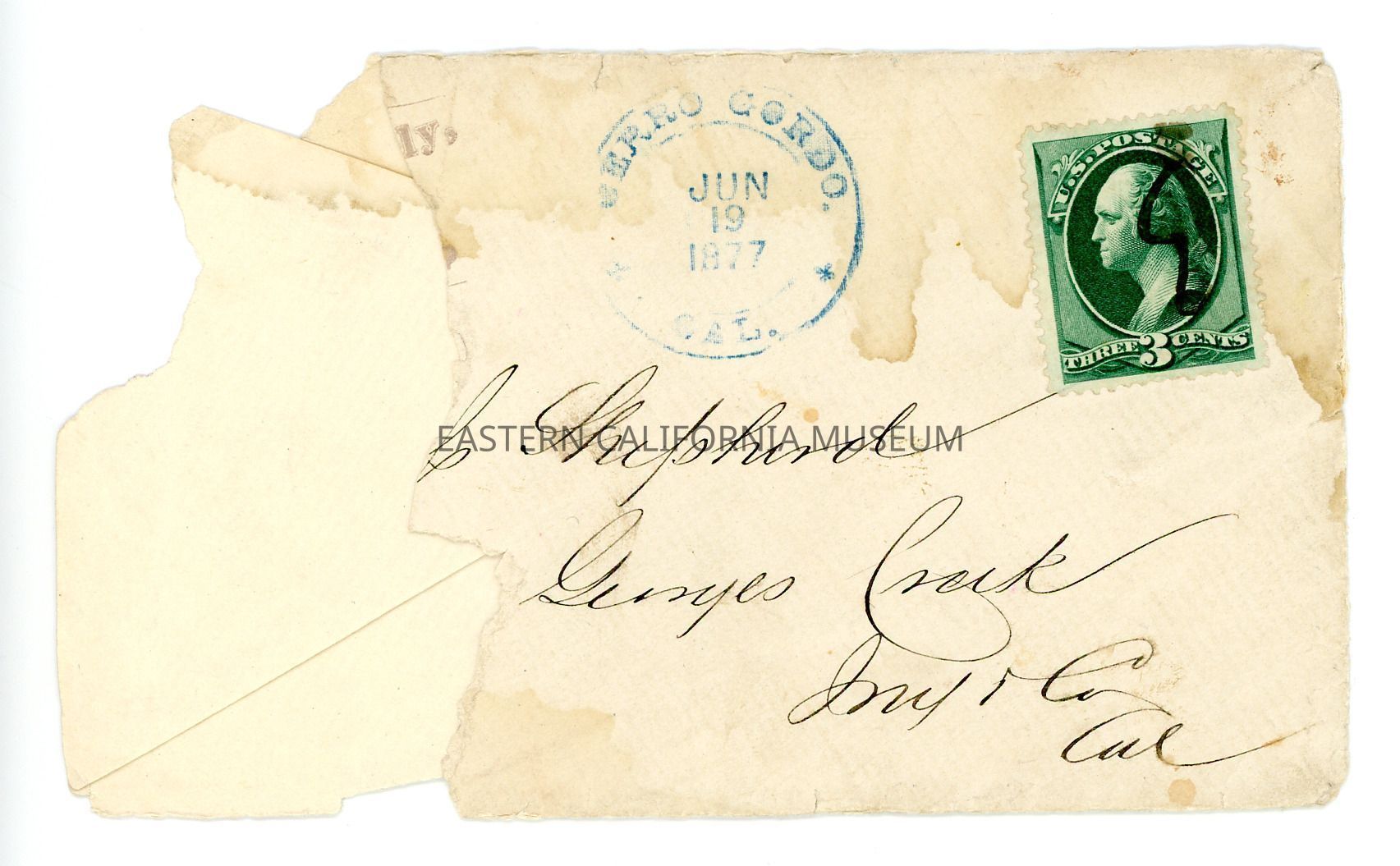 Envelope that contained a program to the July 4th (Independence Day) celebration at Cerro Gordo, 1877. It has a green three cent stamp with a left facing figure (black ink mark cancellation?). The postmark is blue ink from Cerro Gordo dated June 19, 1877. It is addressed to [illegible] Shepherd, Georges Creek, Inyo Co., Cal.