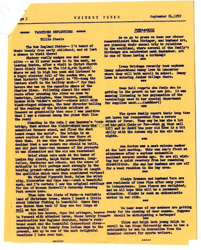 The "Whitney Peeks" newsletter published by the Southern Inyo Business and Professional Women's Club. This one is identified as, "Vol. II, No. V" and "Sept. 24, 1959." Three letter sized pages all of which are an orange color.Collection