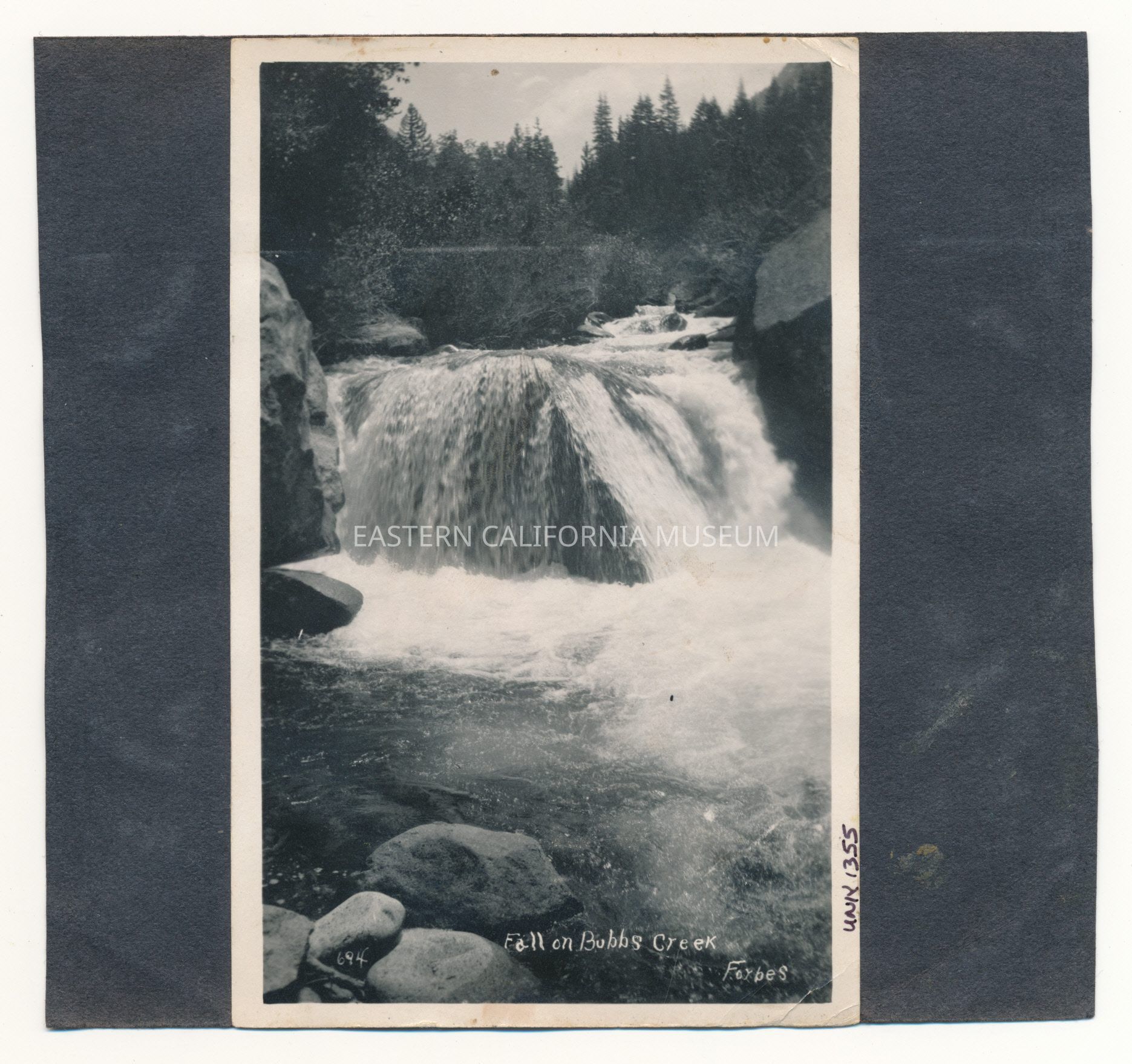 Photo of a small waterfall in a creek. It is titled, "Fall on Bubbs Creek." It was taken by photographer A. A. Forbes and given his ID #694.Made/Created