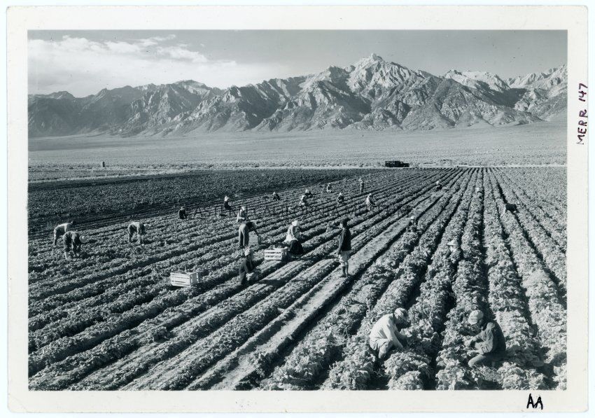 Title from Library of Congress: "Farm, farm workers, Mt. Williamson in background"