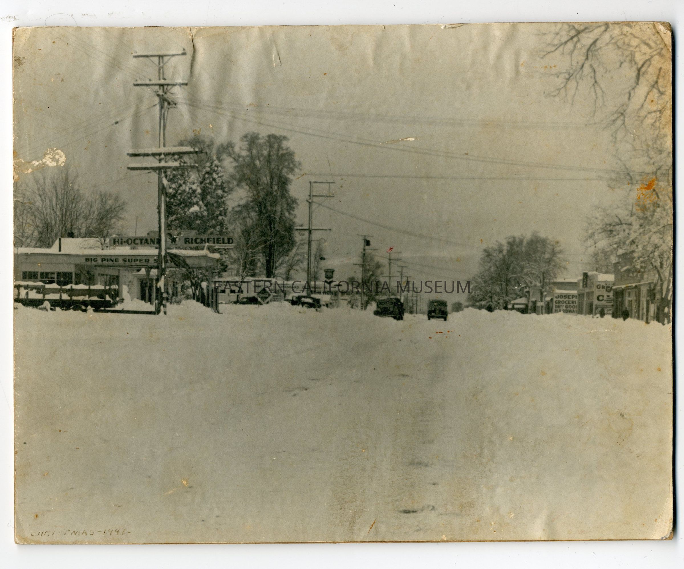 Mounted photo of Big Pine Main Street under a heavy blanket of snow. There are a couple bold automobiles driving in the center of the road. Several businesses are visible: Big Pine Super Service gas station, Chevron gas station, Joseph's Groceries, and a cafe. Written in lower left corner is, "Christmas 1941."Photograph Details