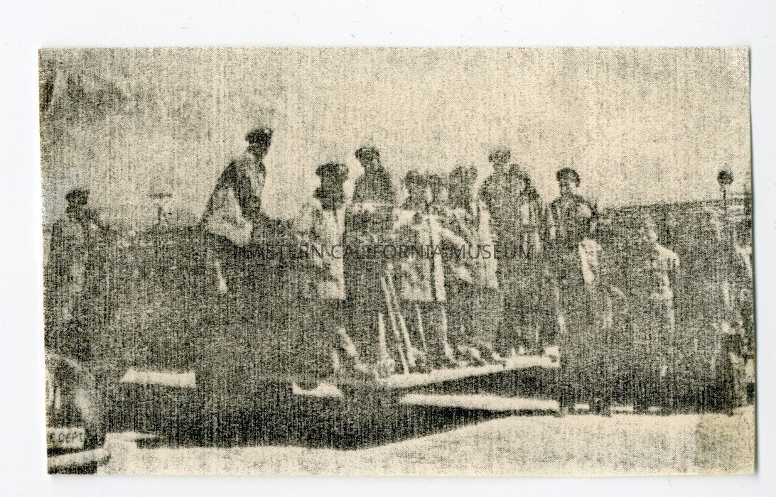 Photocopied photo of a group of men with a truck (firefighters?) at Manzanar War Relocation Center.