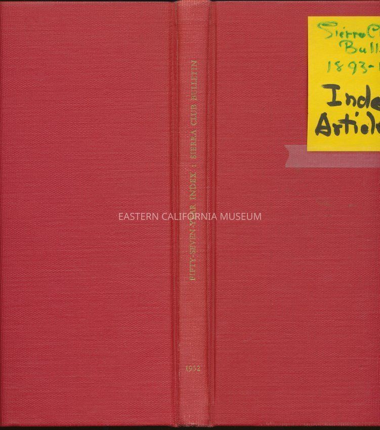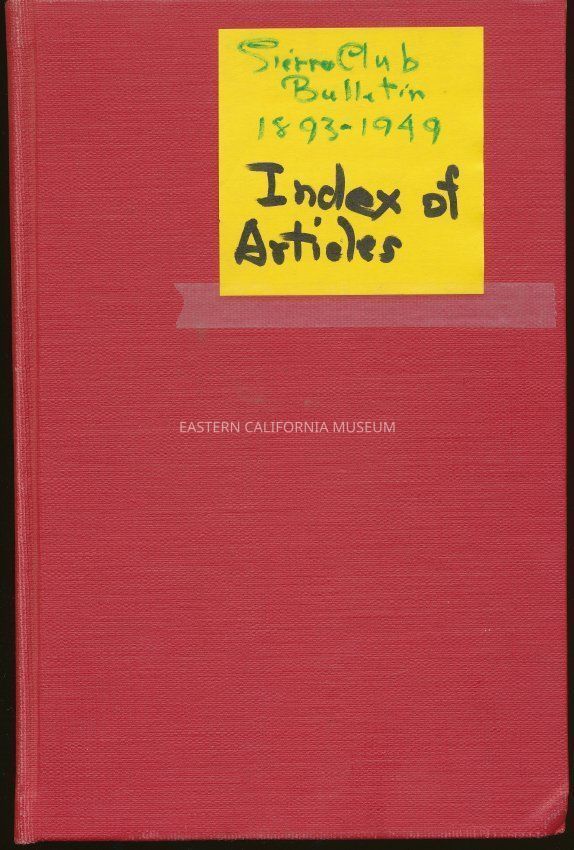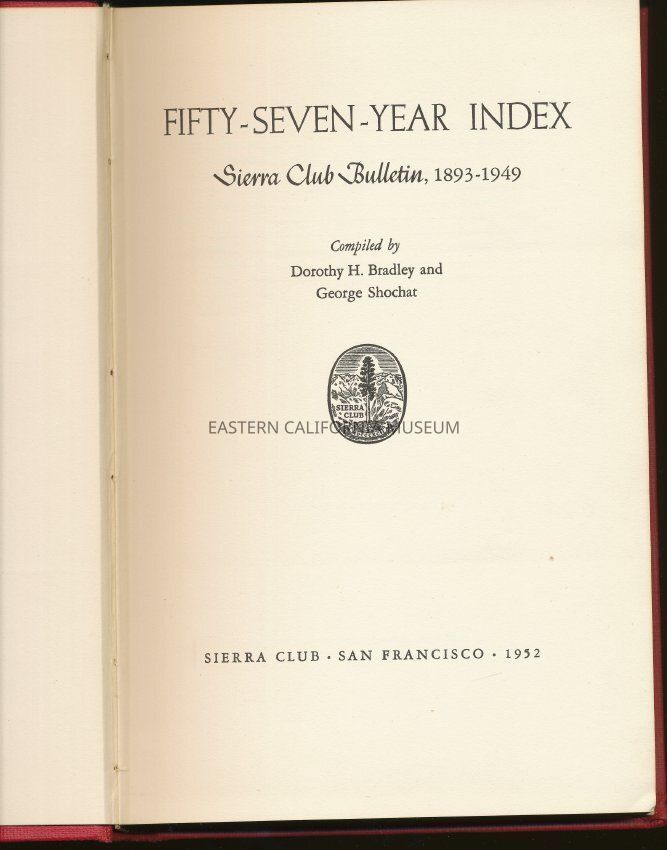 This book is the compilation (index) of the first fifty-seven years of the Sierra Club Bulletin. The listing is Contents by Volume starting with Volume 1 (1893-1896). Then comes an Index by Authors, Book Reviews (page 44, Index of names (page 72), and ending with Subject Index (page 84).