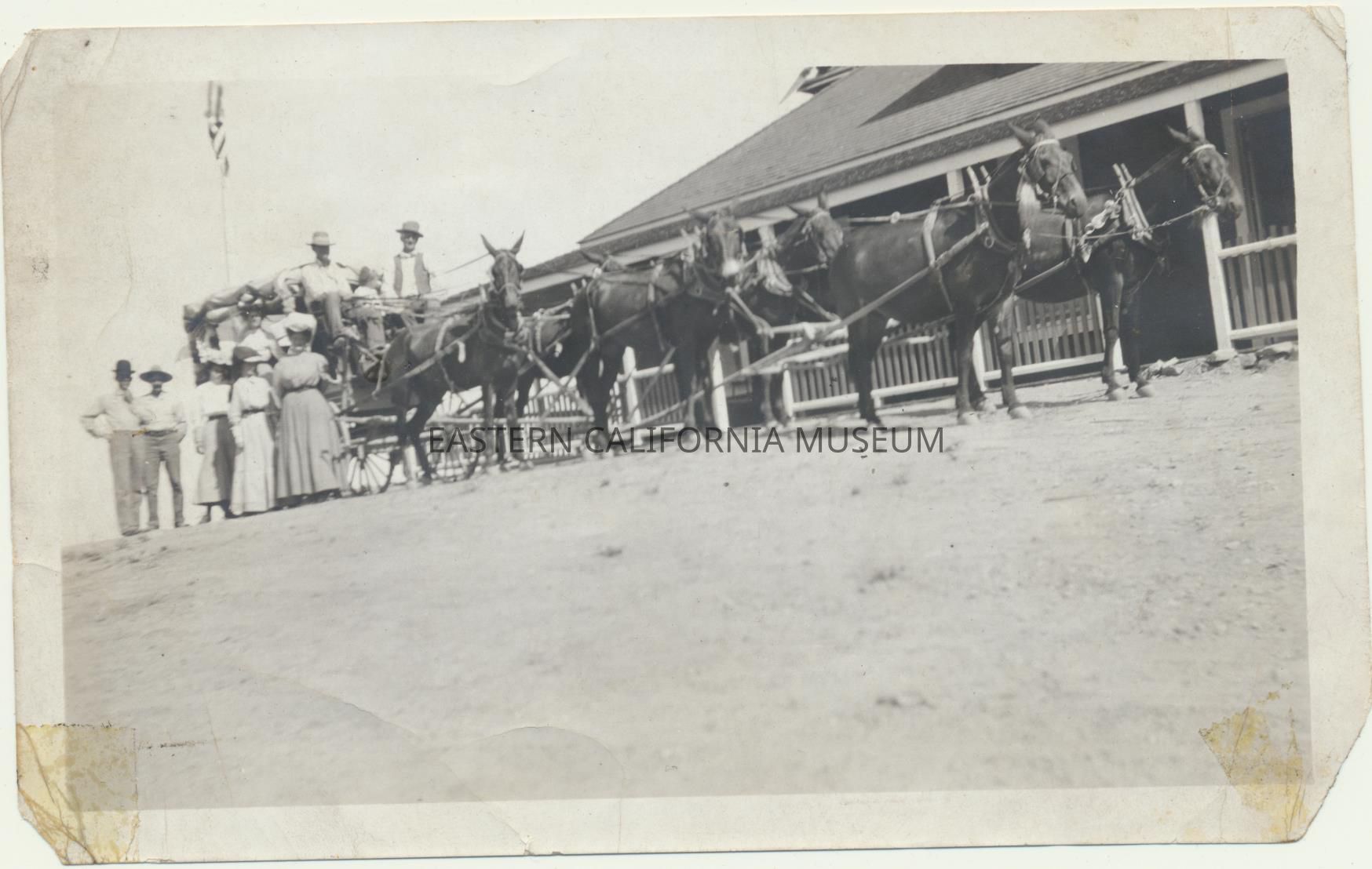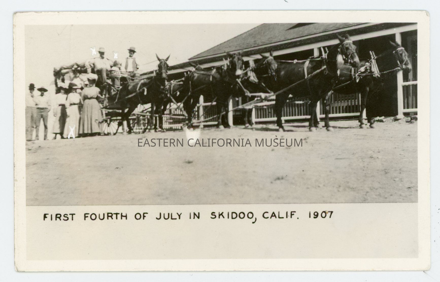 Two photos of the first 4th of July in Skidoo, CA in 1907. Both show a stagecoach with a team of six horses or mules parked in front of a building. There are eight people on or around the stage.