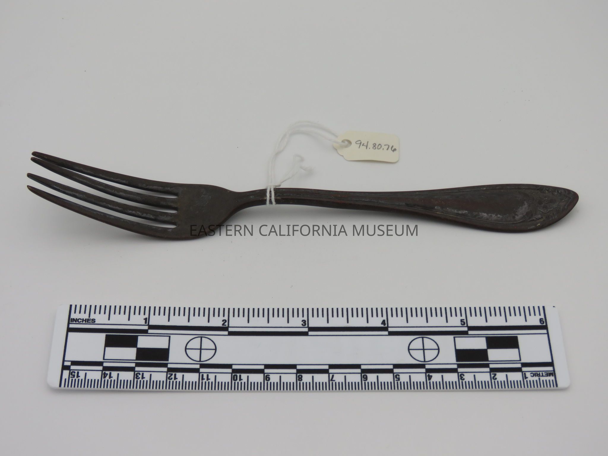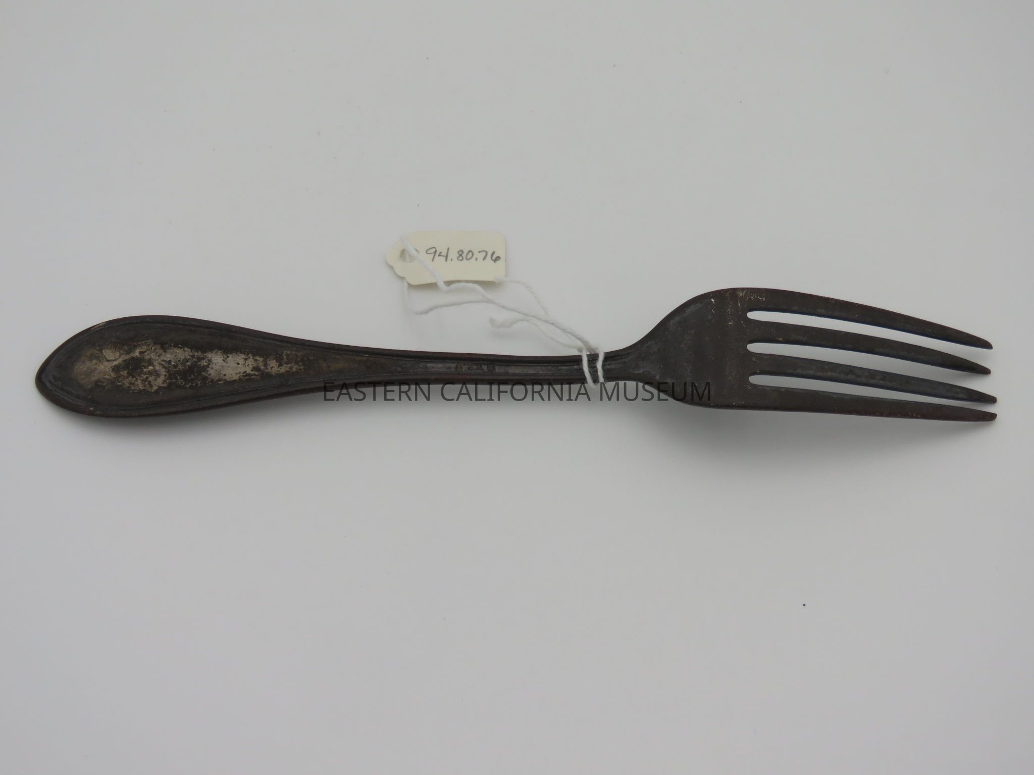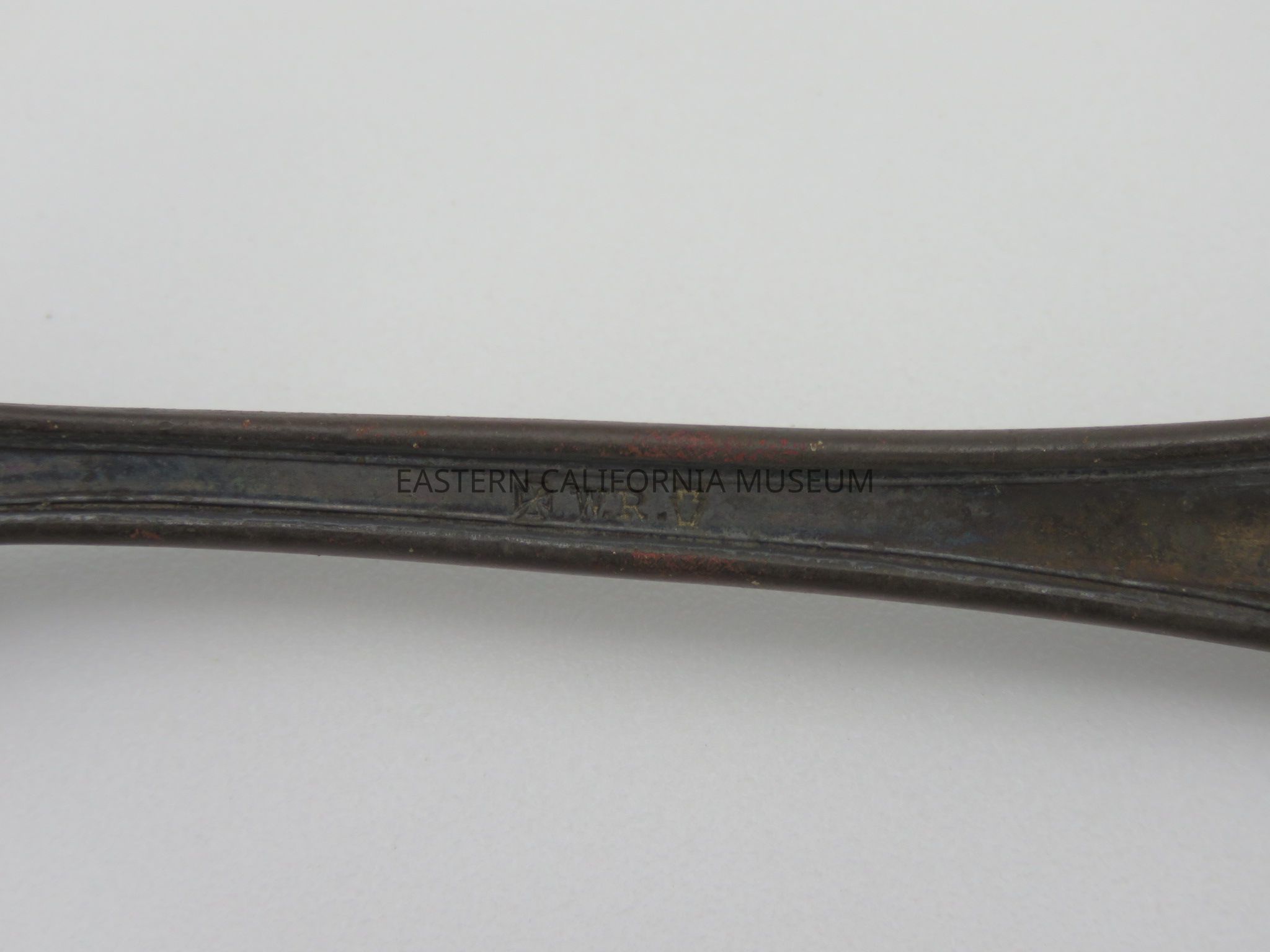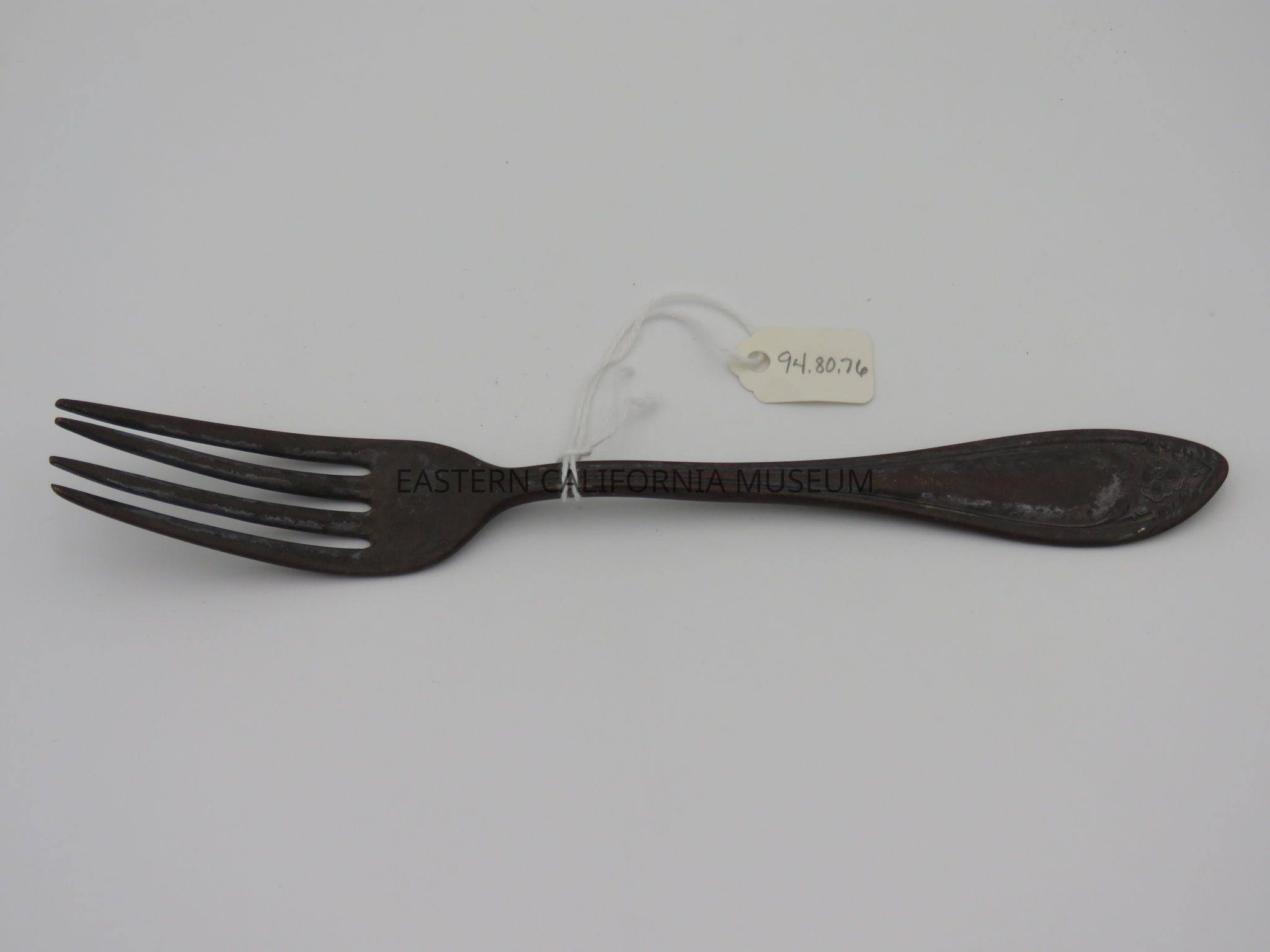 Fork with small floral decorations on the handle and "WR" on the back. Likely used at Manzanar War Relocation Center.