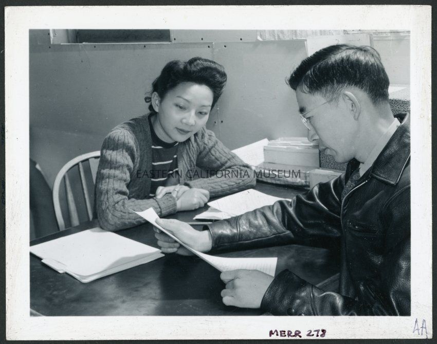 Summary from Library of Congress: "Fumiko Hirata, half-length portrait, seated at a desk, facing Mr. Matsumoto, seated across from her, reading a document"