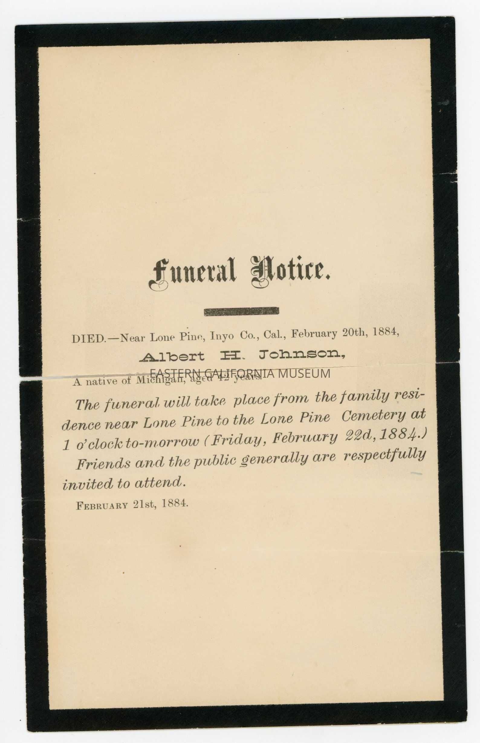 Funeral notice of Albert H. Johnson, who died near Lone Pine on February 20, 1884 at age 42. Paper is black bordered.