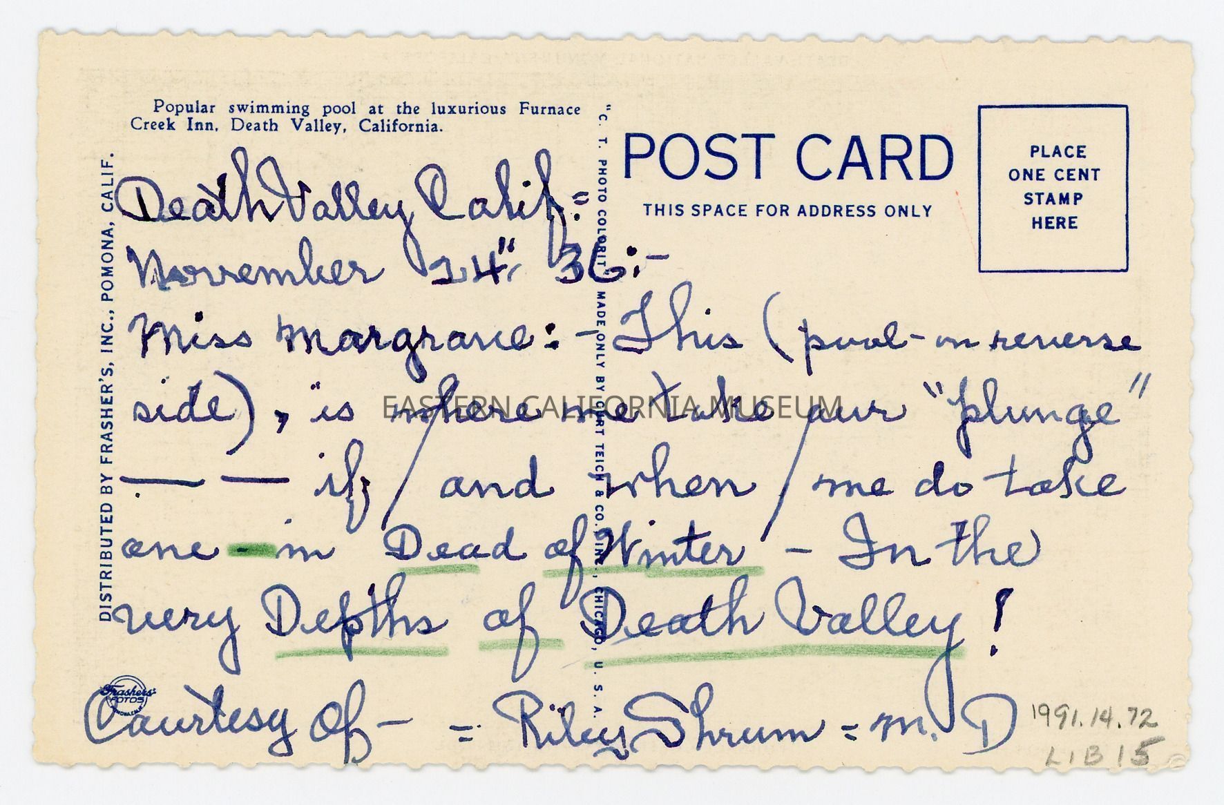 The back of the postcard was written on, but not sent (no cancellation mark, no stamp). It was addressed to Miss Margrave (Inyo County Librarian) from Riley Shrum, M.D. and was dated November 24, 1936. It says, "This (pool on reverse side) is where we take our pluge if--and when--we do take one in dead of winter in the very depths of Death Valley!"