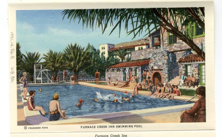 Color print of people frolicking by the swimming pool at the Furnace Creek Inn in Death Valley. It is on textured paper.