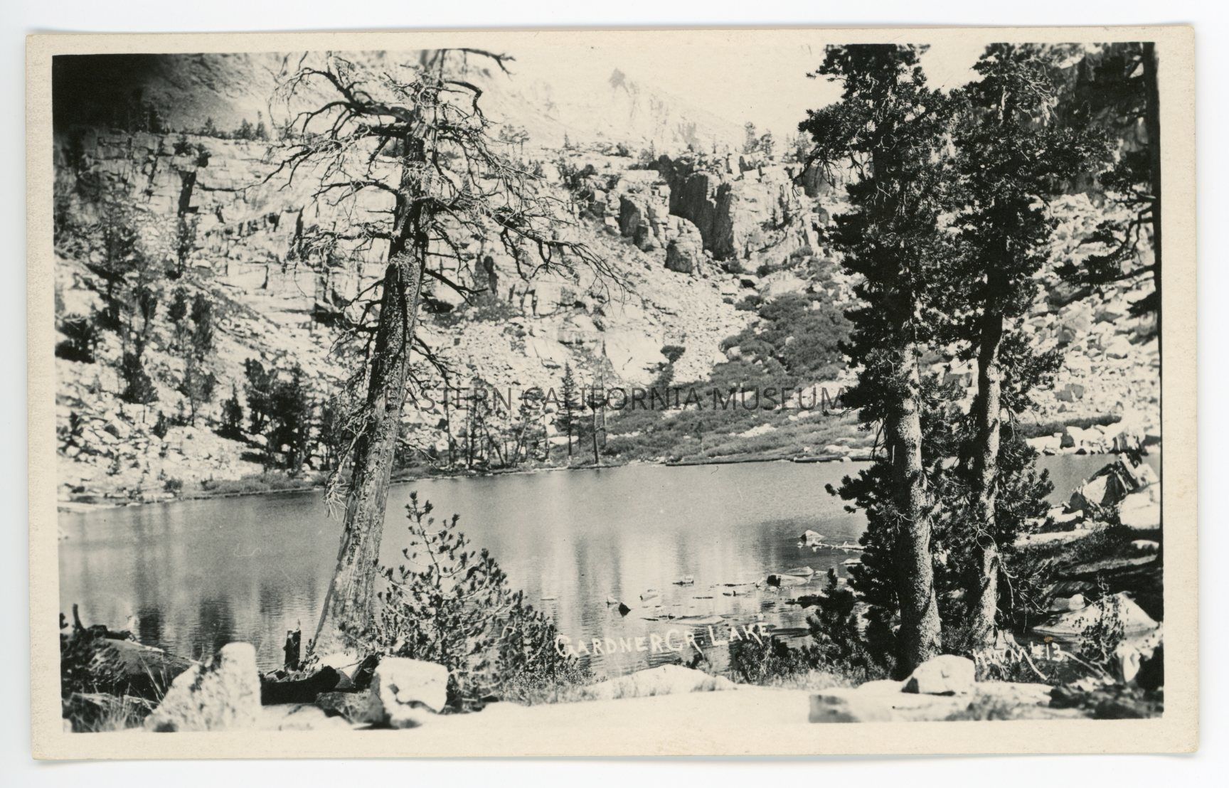 Photo postcard titled, "Gardner Cr. [Creek] Lake" taken by photographer H. W. Mendenhall and given his ID #413.