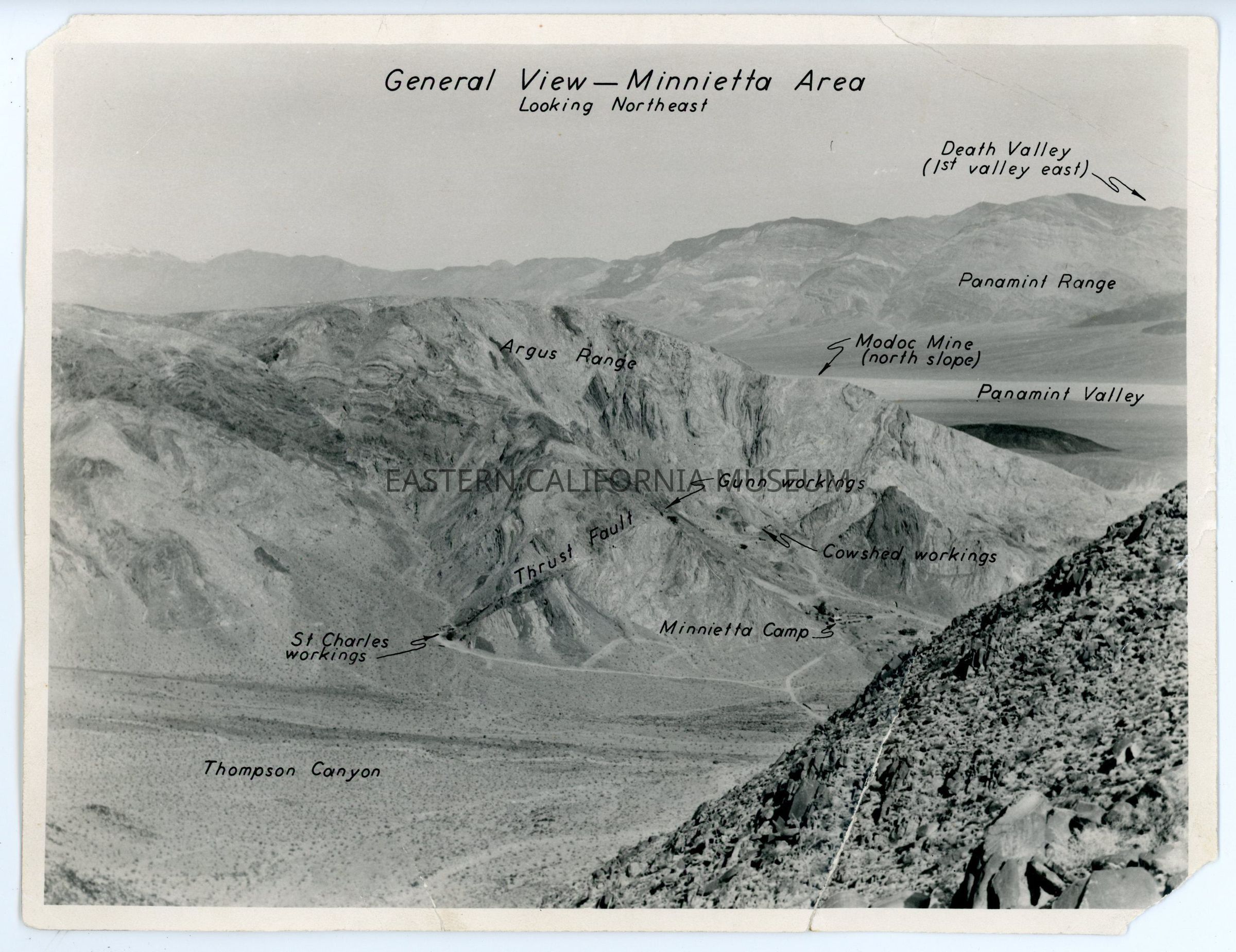 Photo titled, "General View--Minnietta Area Looking Northeast." Many features of the landscape are labeled.