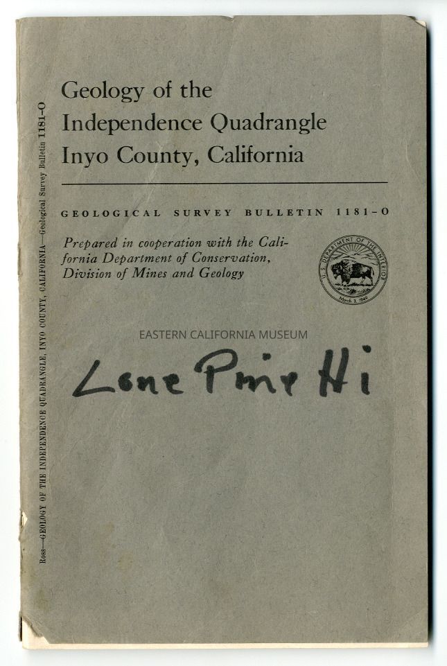 "Geological Survey Bulletin 1181-O: Geology of the Independence Quadrangle, Inyo County, California" contains 1 of 1 maps in back pocket. Cover is detached and has "Lone Pine Hi" written in black marker on front.Publication Details