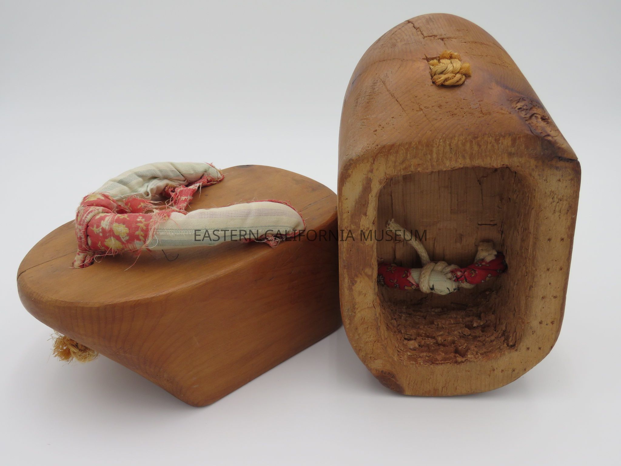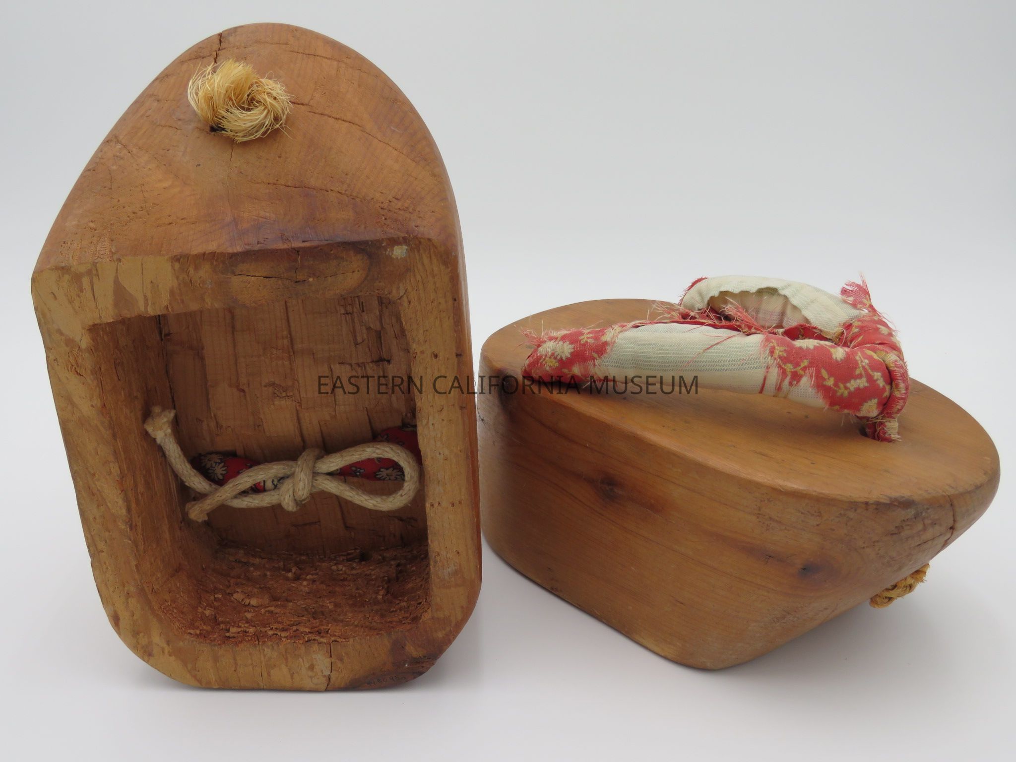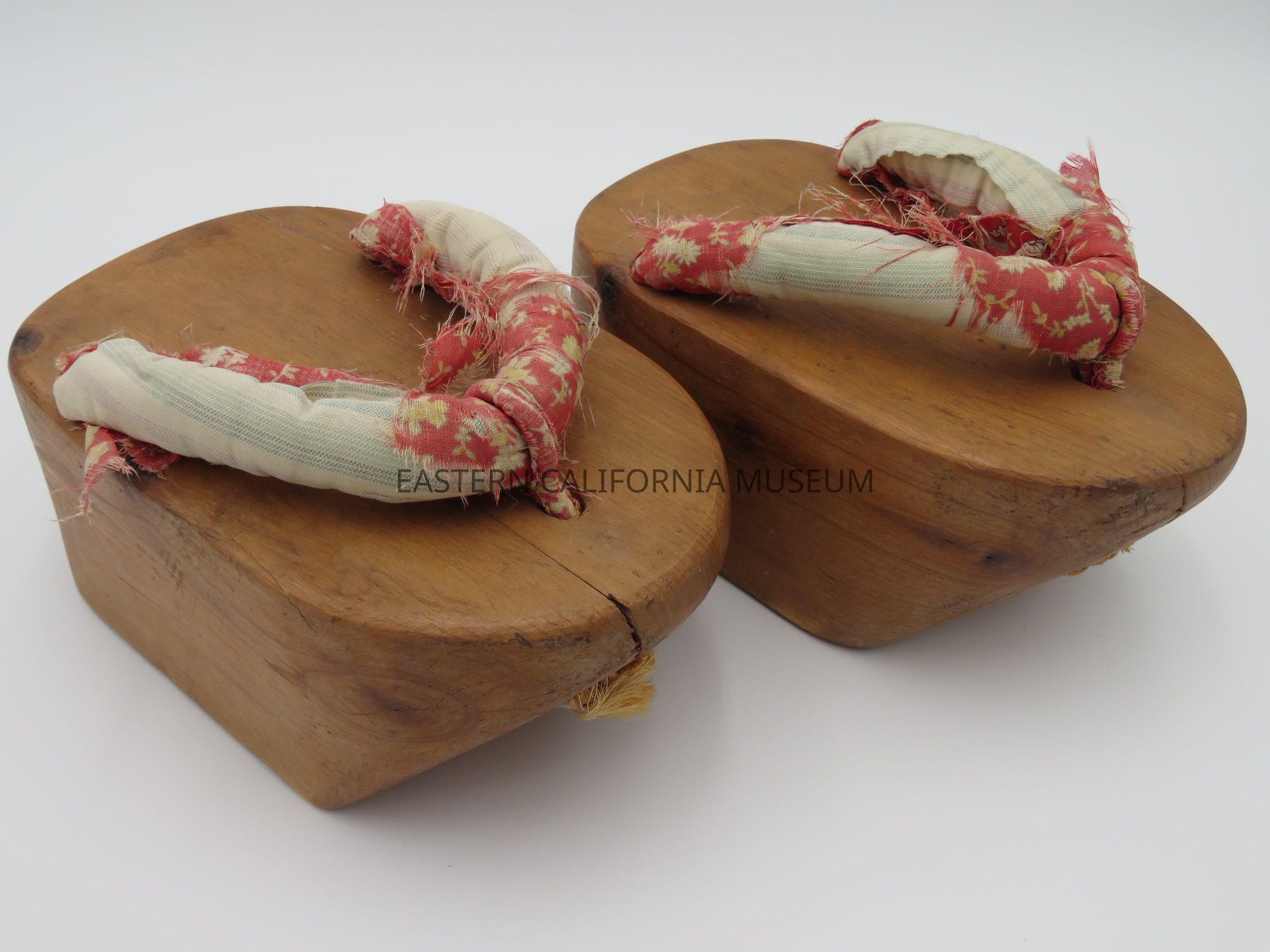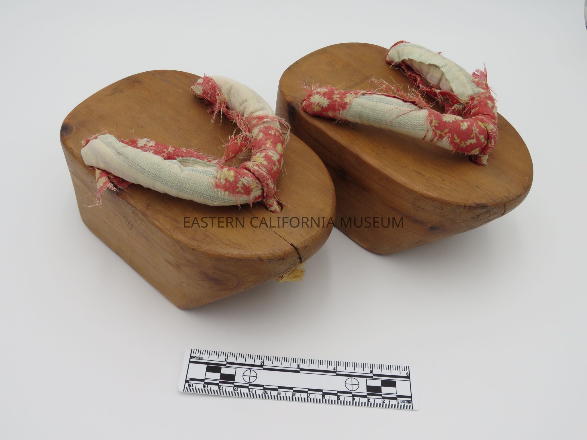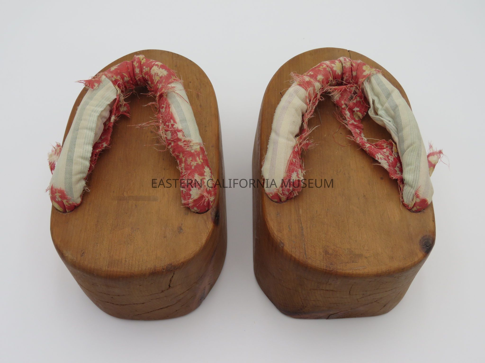 Pair of geta with worn red cloth thongs. Base is carved wood about 8.5" long x 5" wide x 3.5" high with a cavity in the sole. There are cracks in the wood. They were likely made at Manzanar War Relocation Center.Collection