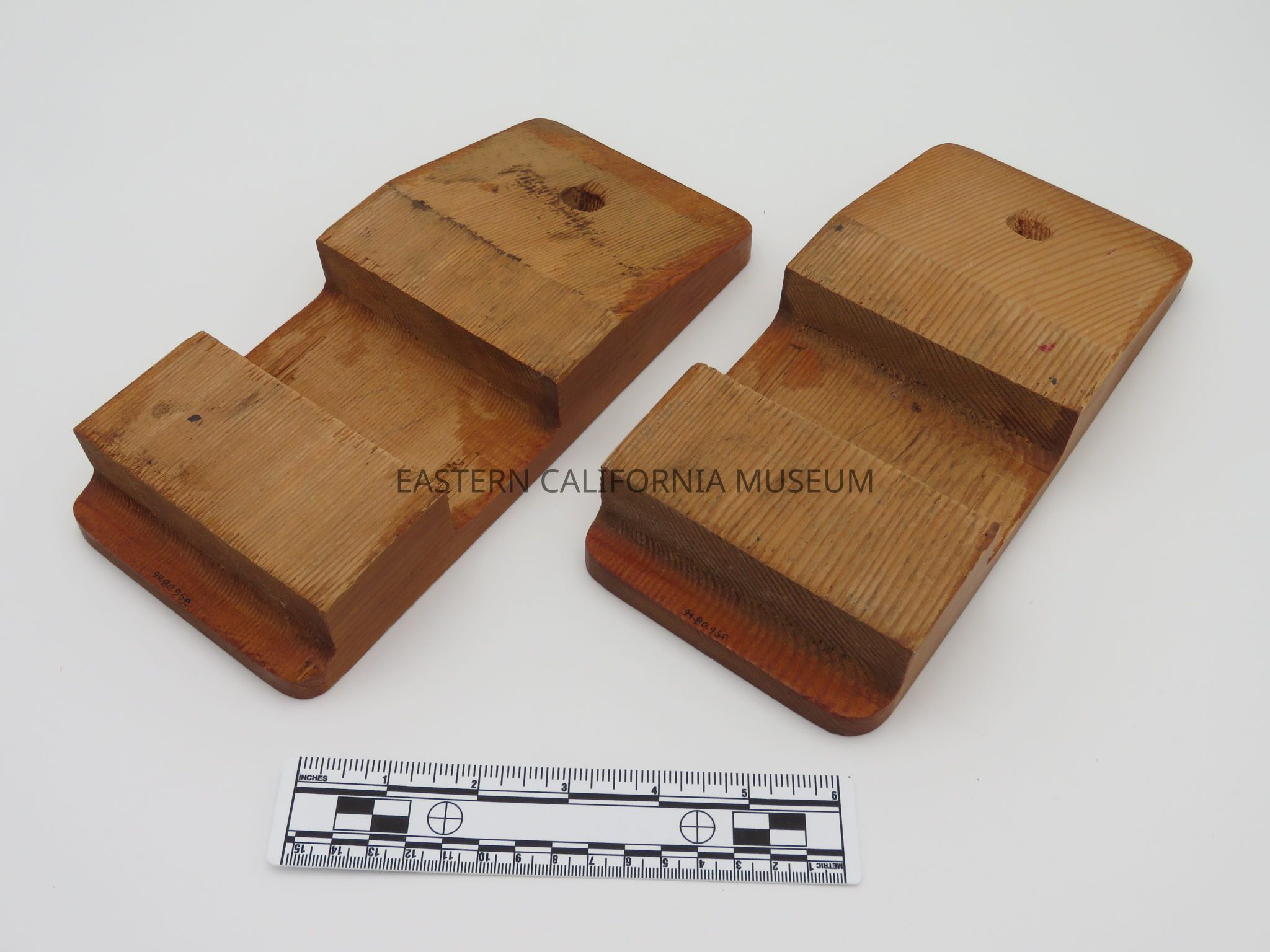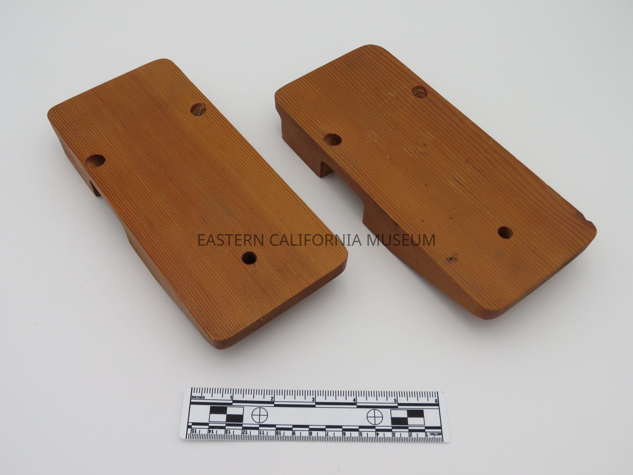 One of three pairs of unfinished wooden getas designed and made by Shukue Kono, Block 36-4-1. Size is 9.5 x 4 x 1.5". They are square with rounded corner, three holes for straps, "17" penciled underneath, edges worn. They were likely made at Manzanar War Relocation Center.Collection