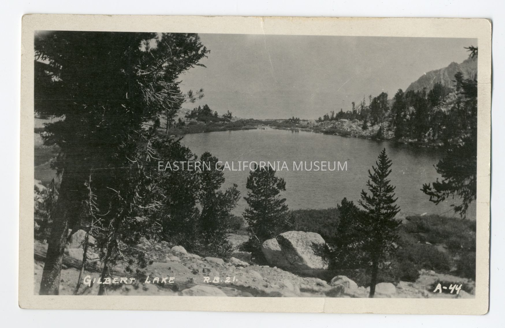 Photo postcard of Gilbert Lake in the Sierra Nevada mountain range. Photo also contains labels "R.B.21" and "A-44." R.B. may be the photographer's initials, and 21 may refer to the year 1921.Collection